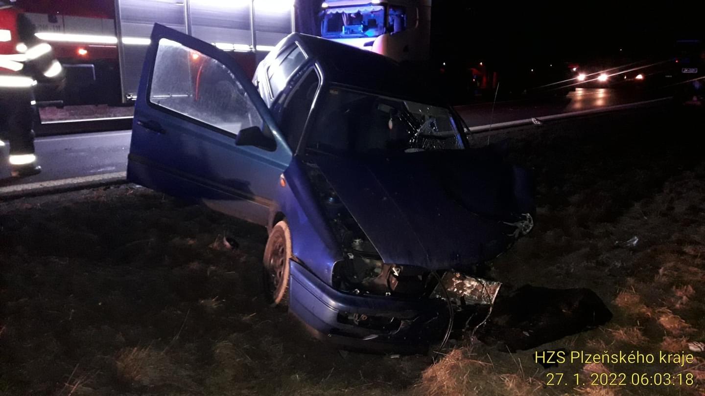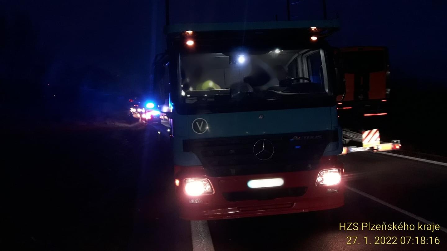 Dnes před šestou hodinou ráno došlo na hlavním tahu z Plzně na Domažlice mezi Chotěšovem a Stodem k dopravní nehodě, při které se čelně střetl nákladní vůz Mercedes s osobním vozem Volkswagen Golf.