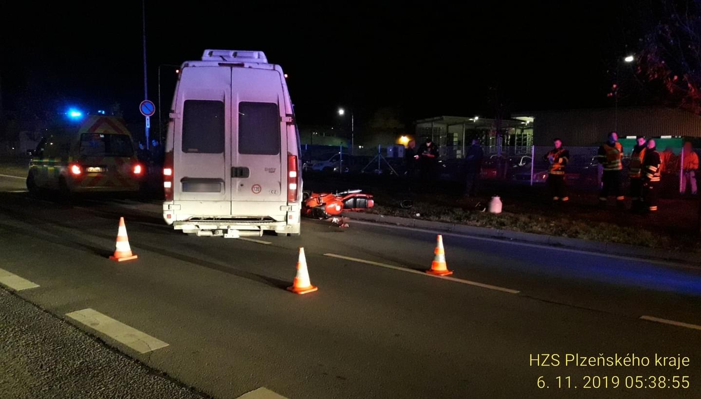 Dnes ráno před půl šestou vyjížděla z brány Panasonicu v Plzni na Borských polích dodávka Iveco Daily, jejíž řidič odbočoval vlevo a dle všeho nedal přednost motorkáři na stroji Honda, přijíždějícímu od Folmavské ulice. Motorkář po střetu spadl.