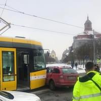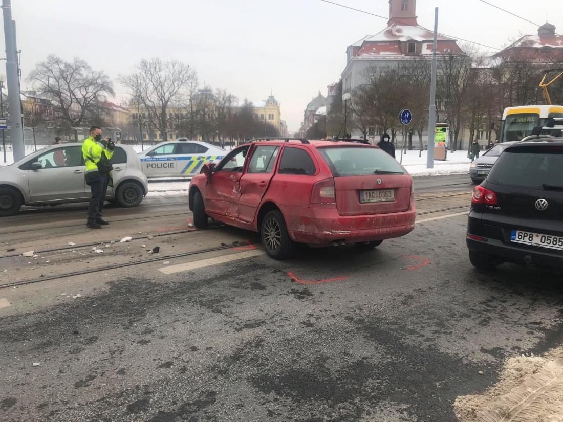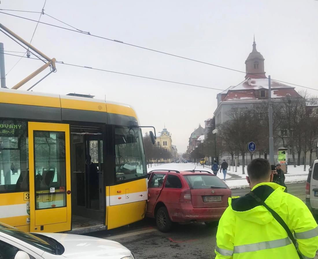 Dnes před jednou hodinou odpoledne došlo na Mikulášském náměstí v Plzni ke střetu tramvaje linky číslo 1 jedoucí na Slovany a vozu Škoda