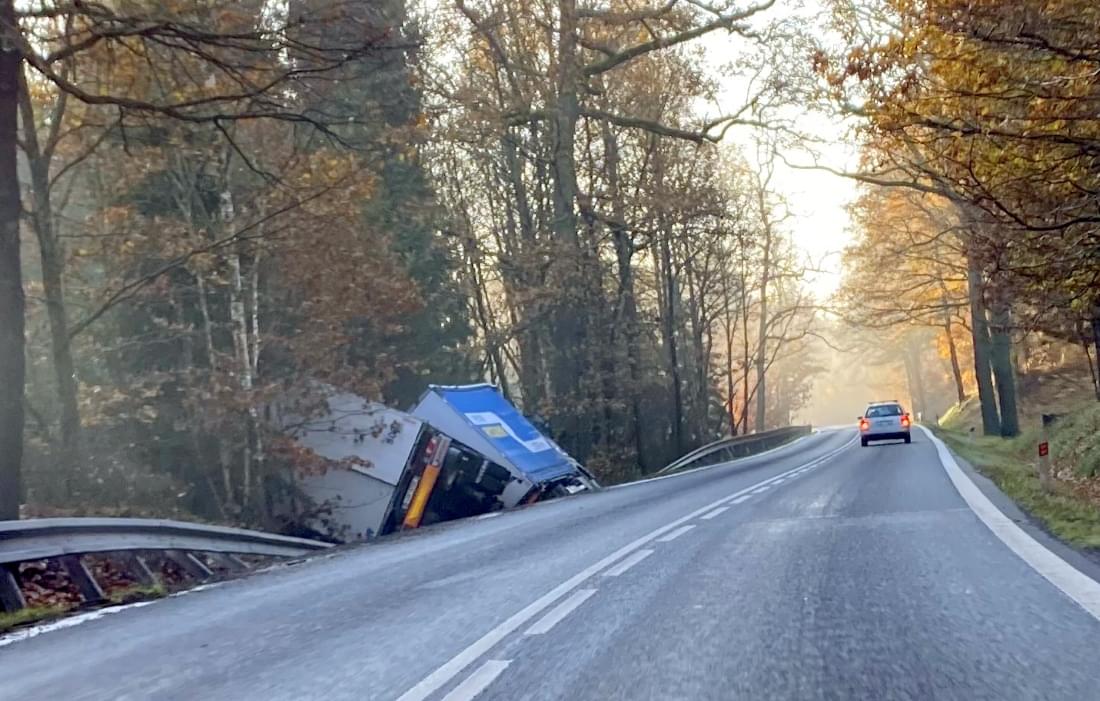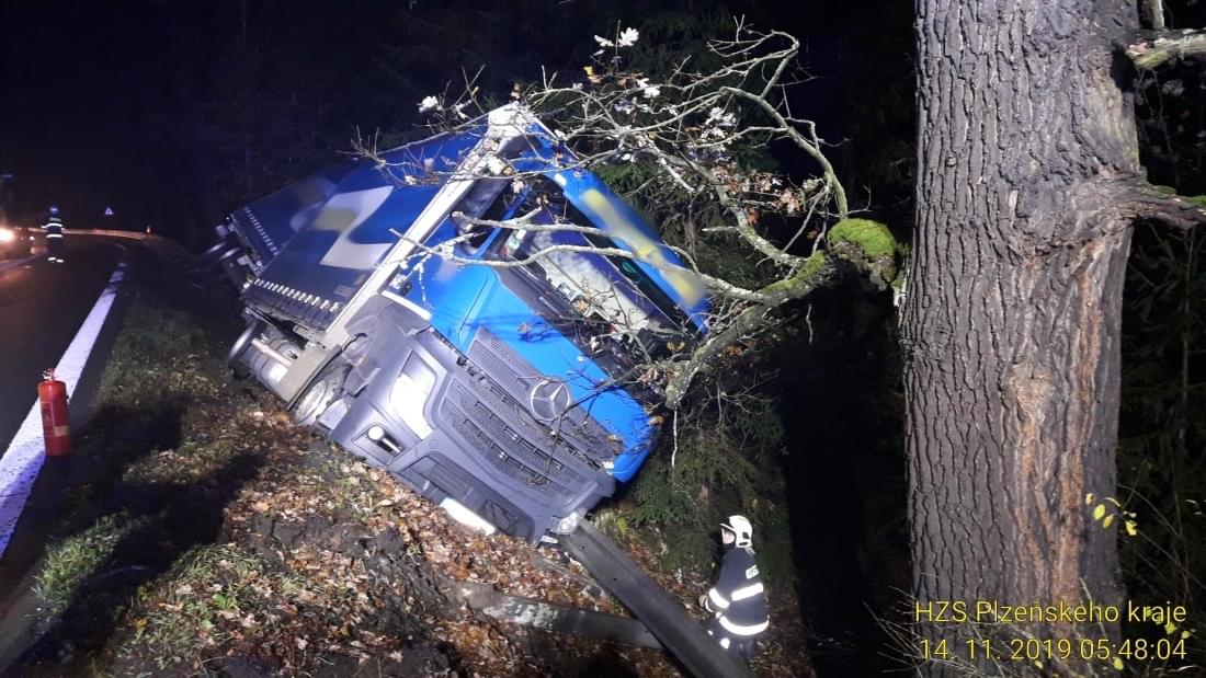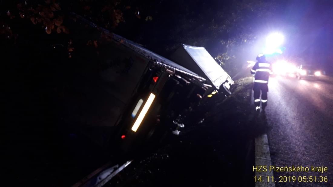 Dnes pět minut po páté hodině ráno došlo na silnici 27 u Horní Břízy k havárii nákladní soupravy.