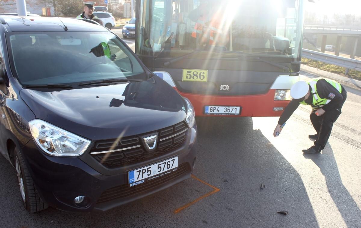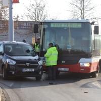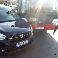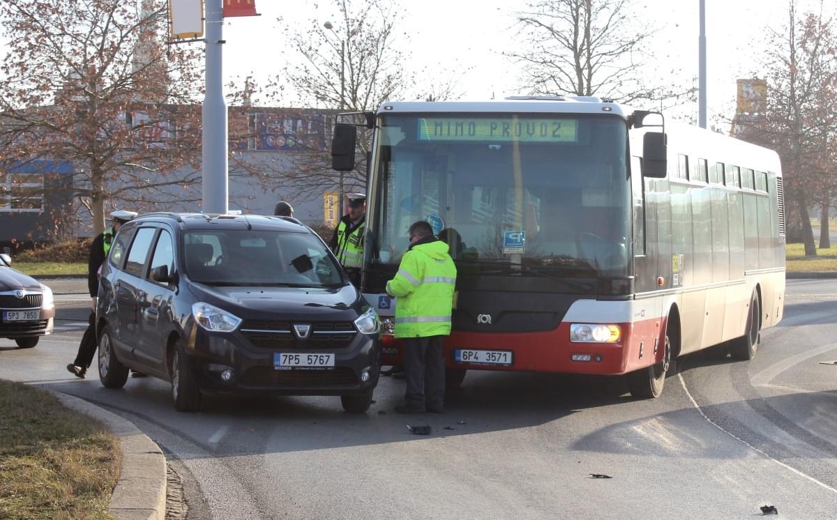 Ke střetu linkového autobusu s osobním vozem Dacia došlo dnes před půl třetí odpoledne na vjezdu na kruhový objezd z ulice Otýlie Benýškové.