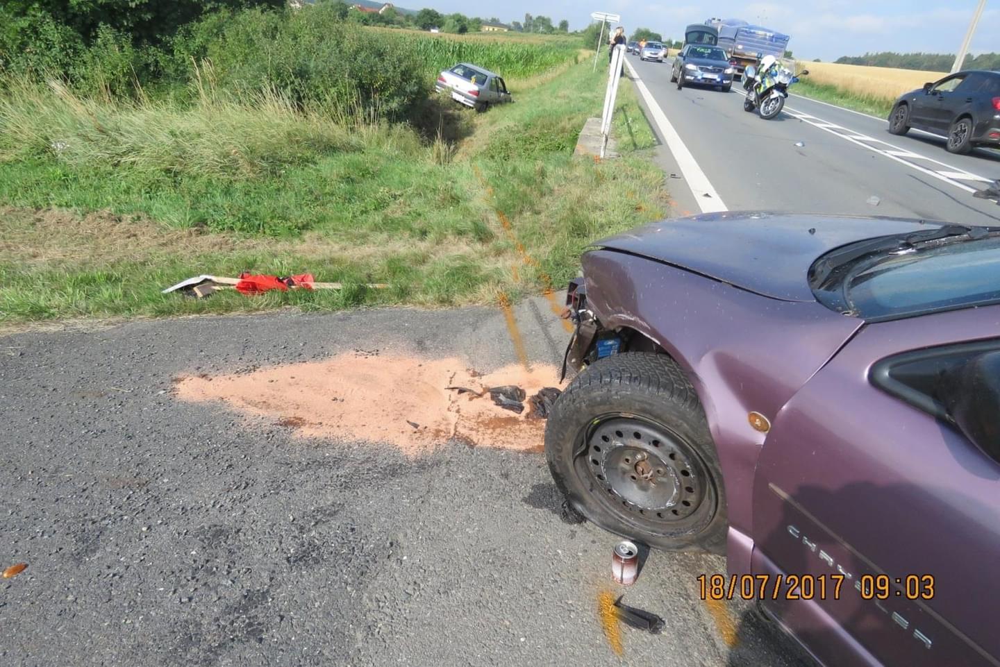 "Dvacetiletý řidič Peugeotu podle jeho vyjádření zazmatkoval, ve snaze zabránit střetu chtěl vozidlo Chrysler objet z levé strany, přičemž však došlo v levém jízdním pruhu ke střetu vozidel. Se svým vozidlem pak vyjel mimo pozemní komunikaci do příkopu. Utrpěl zranění, se kterým ho záchranáři převezli do domažlické nemocnice k ošetření. Policisté dechovými zkouškami u obou dvacetiletých řidičů vyloučili požití alkoholických nápojů před jízdou," uvedla k nehodě tisková mluvčí policie.