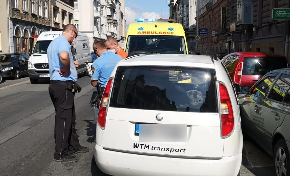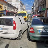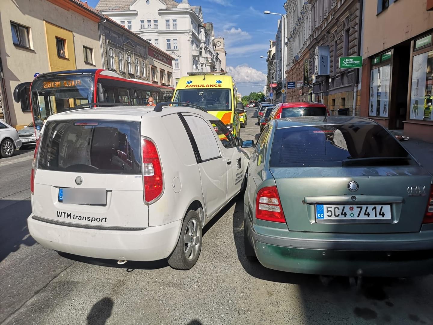 Dnes kolem páté hodiny odpoledne došlo v Husově ulici v Plzni k dopravní nehodě, při které řidič s vozem Škoda Roomster jedoucí směrem od autobusového nádraží narazil nejprve do betonových zábran na křižovatce s ulicí Koperníkova, pak škrtl o zrcátko u kraje silnice odstaveného vozu Opel a nakonec naboural do zaparkovaného vozu Škoda Octavia.