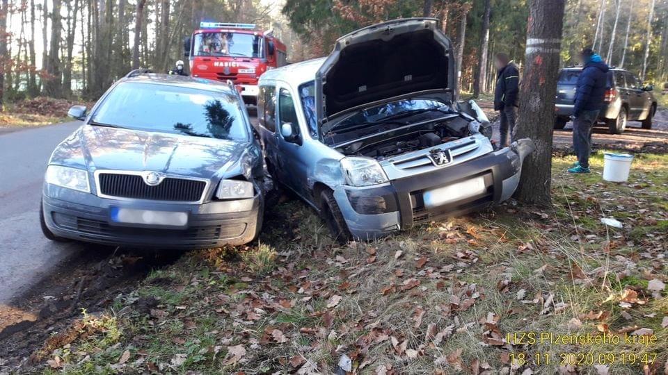 Dnes v půl deváté dopoledne došlo na silnici mezi Horní Břízou a Oborou k dopravní nehodě, po které dva vozy skončily mimo silnici a jeden navíc narazil do kmene stromu.