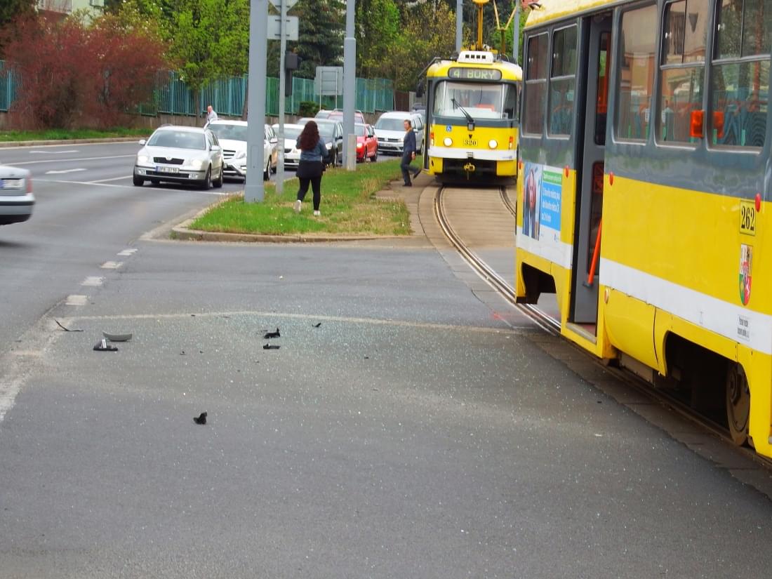Dnes kolem osmé hodiny ráno došlo na křižovatce Karlovarské třídy a ulice Na Chmelnicích v Plzni ke střetu tramvaje linky číslo 4 jedoucí do centra a osobního vozu Ford Focus.