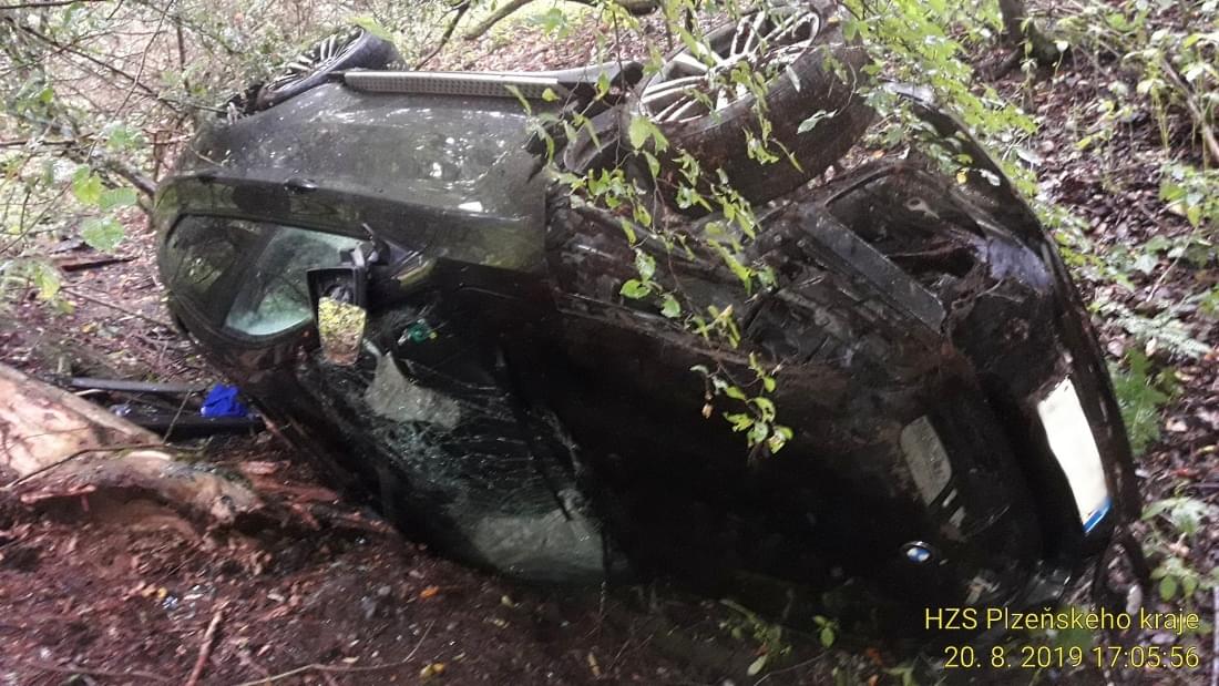 Vůz BMW byl při nehodě odmrštěn mimo silnici, kde se převrátil na bok, Peugeot po střetu skončil také mimo silnici ve svahu.