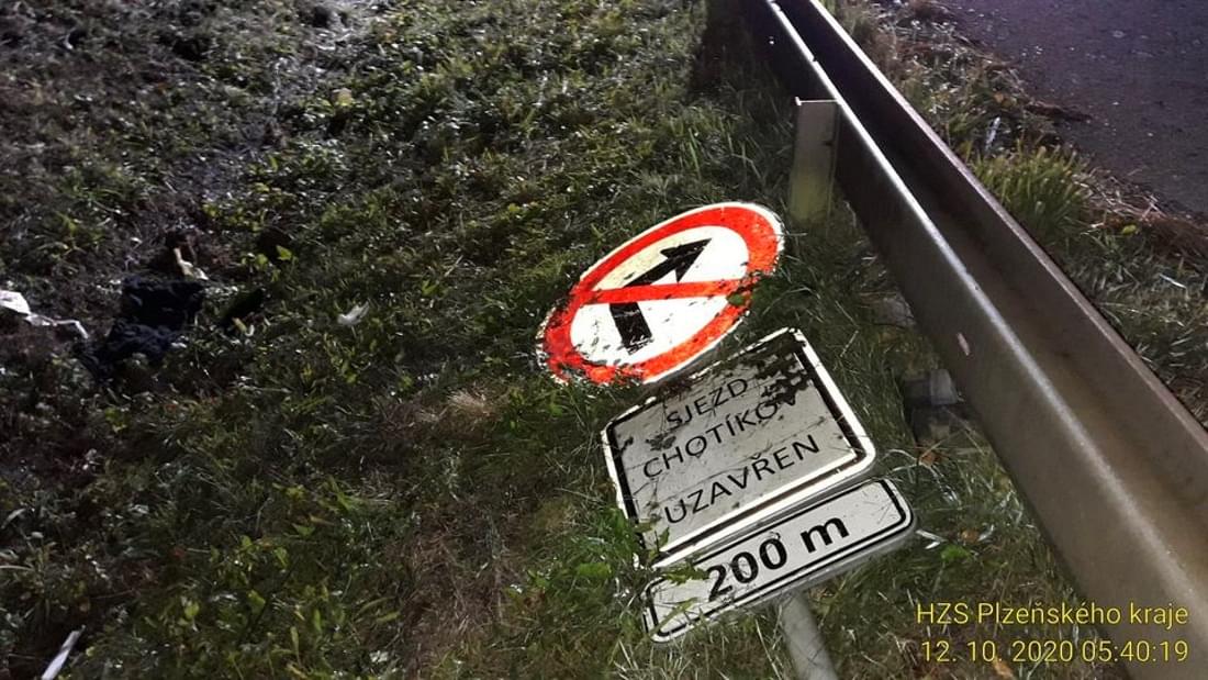 "Řidič narozený v roce 1974 jel směrem od Plzně na Chotíkov, když vyjel na pravou krajnici a vyjel mimo silnici, kde havaroval," popsala tisková mluvčí policie s tím, že se vůz srazil dopravní značku a poté se převrátil přes střechu. Havárie se naštěstí obešla bez zranění osob. Hasiči zajistili místo události a provedli protipožární opatření a policisté řidiče podrobili dechové zkoušce na alkohol, která vyšla s negativním výsledkem.