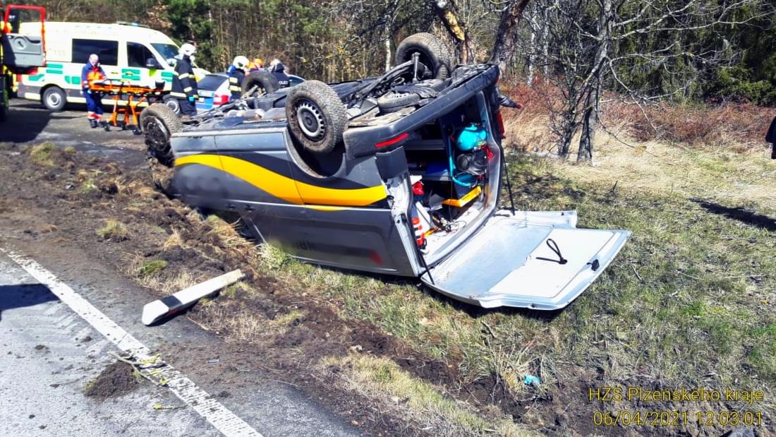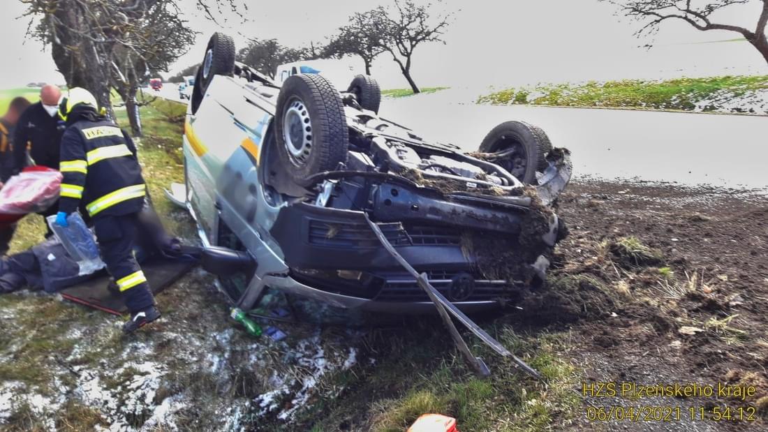 Dnes před polednem došlo na silnici ze Stříbra do Plané mezi Krásným Údolím a Víchovem k havárii dodávky Volkswagen Transporter, která se po vyjetí ze silnice převrátila na střechu.