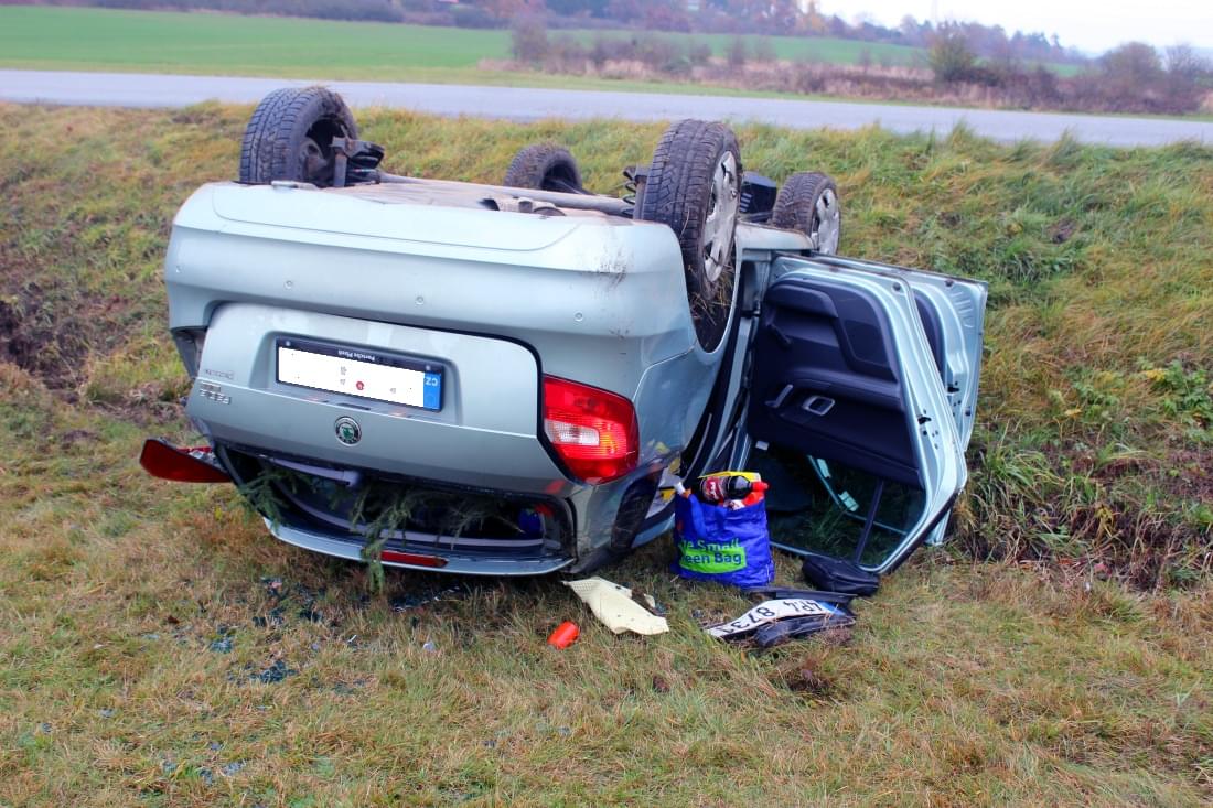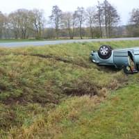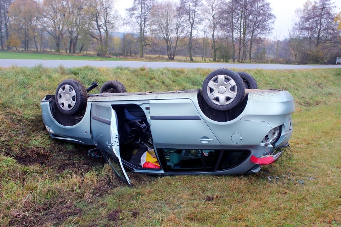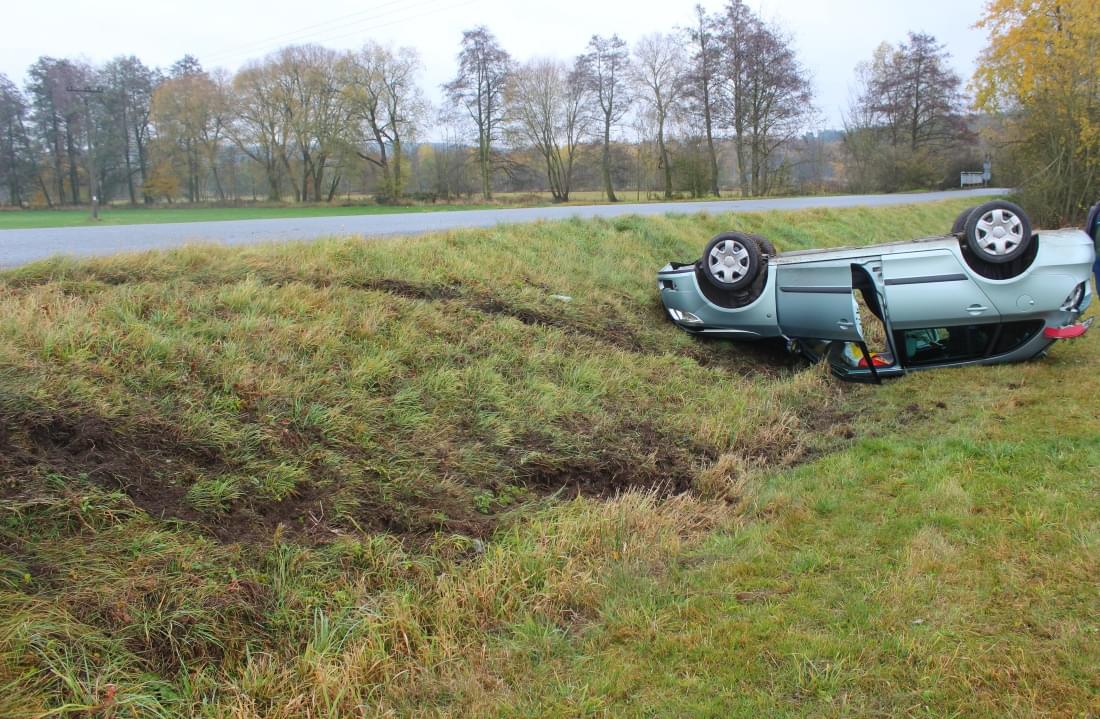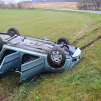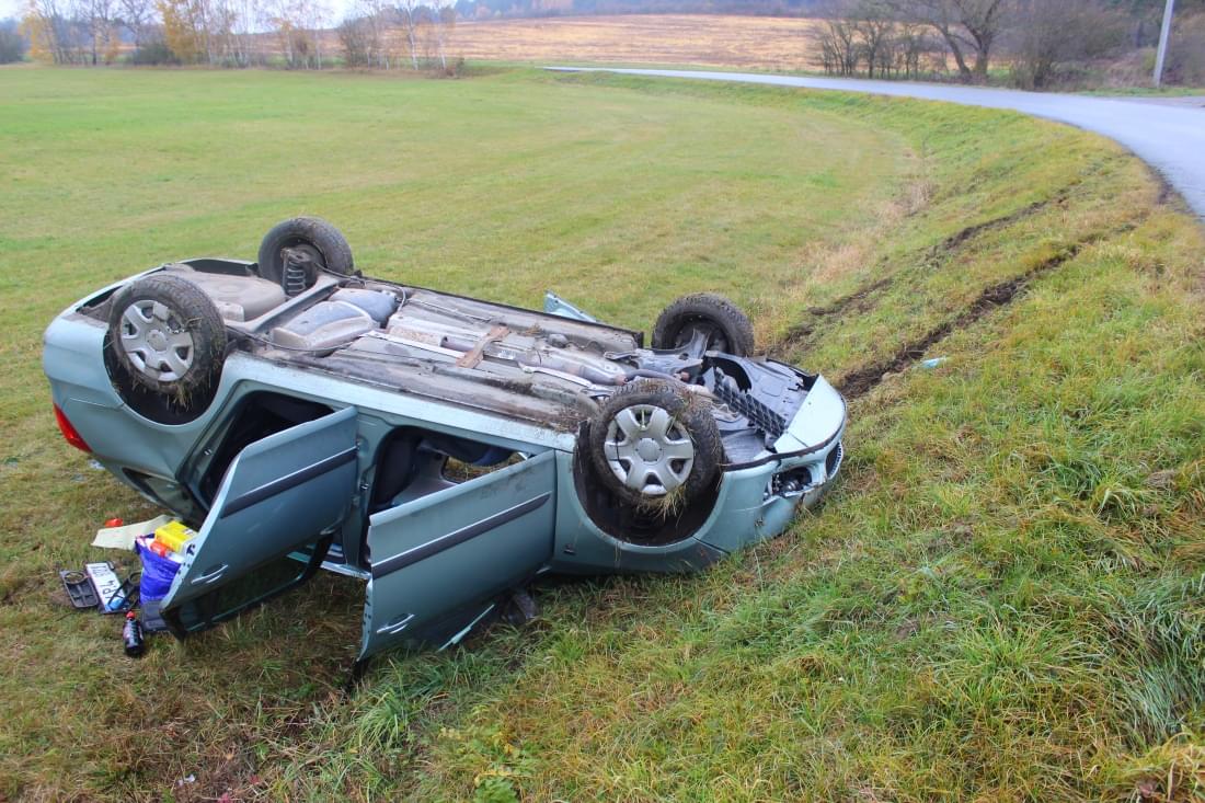 Starší řidič jel od Horní Břízy, když na vlhké silnici v pravotočivé zatáčce dostal smyk a havaroval na louku, kde se auto převrátilo na střechu.