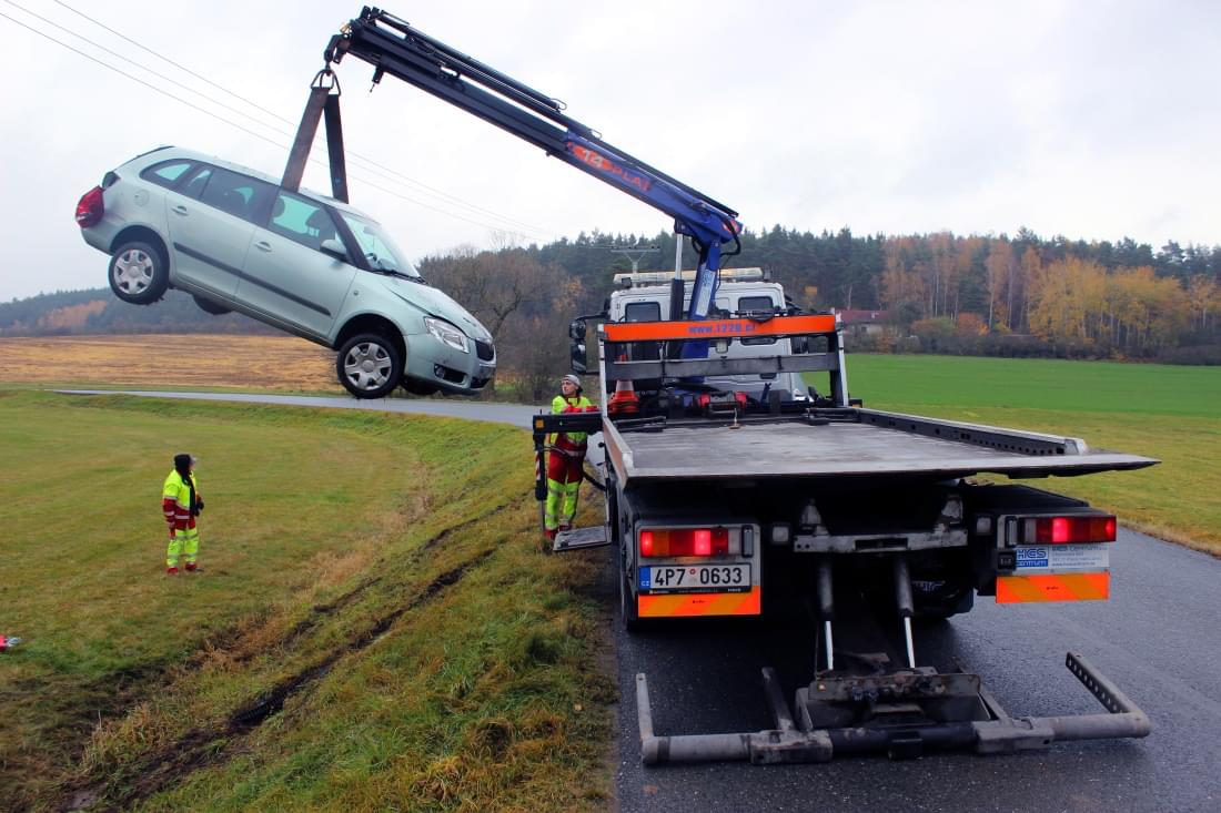 Po dobu vyprošťování vozu byla silnice průjezdná kyvadlově.