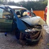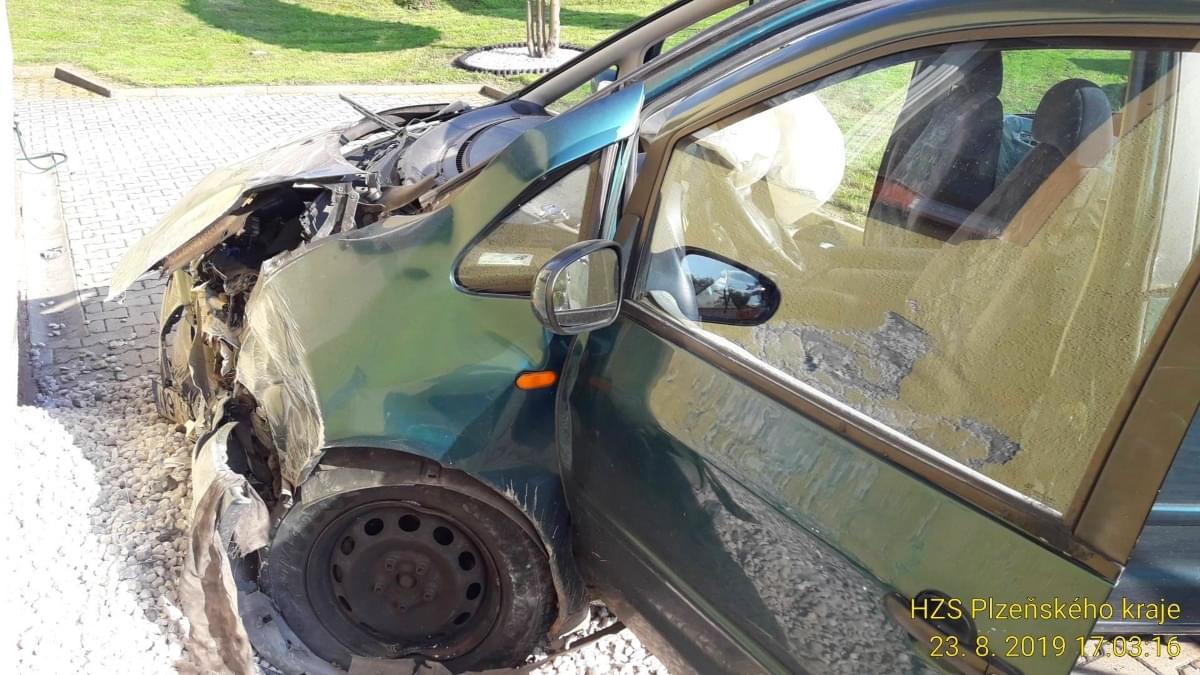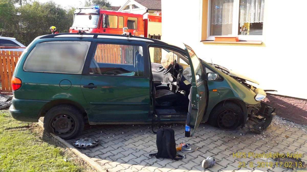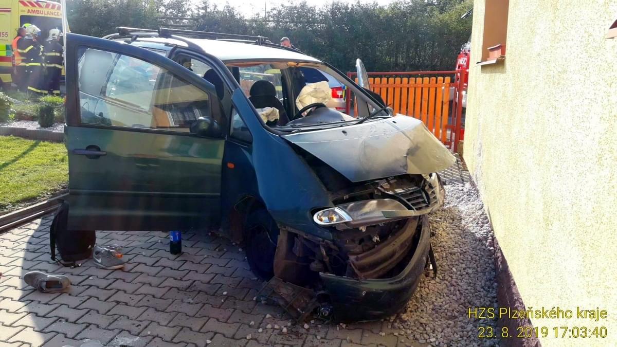 Ke druhé havárii došlo před pátou odpoledne ve Skočicích u Přeštic, kde řidič vozu Volkswagen Sharan nezvládl zatáčku, vyjel ze silnice, prorazil plot a narazil do domu č. 88.