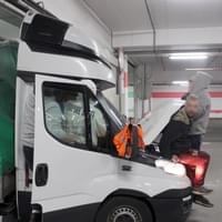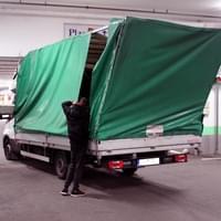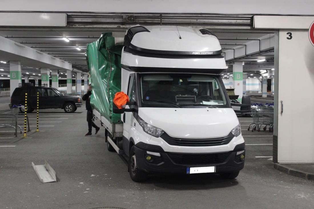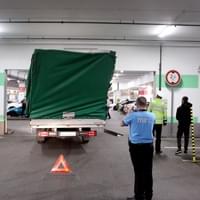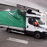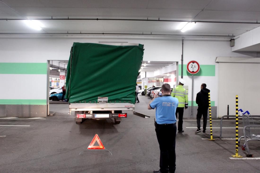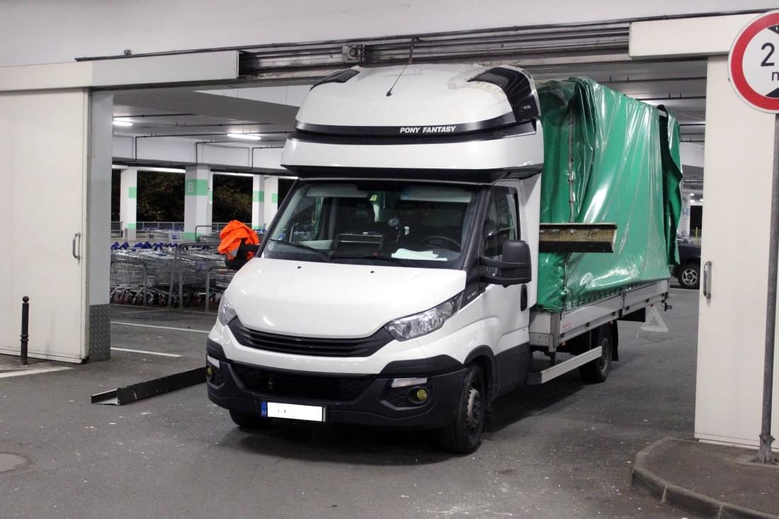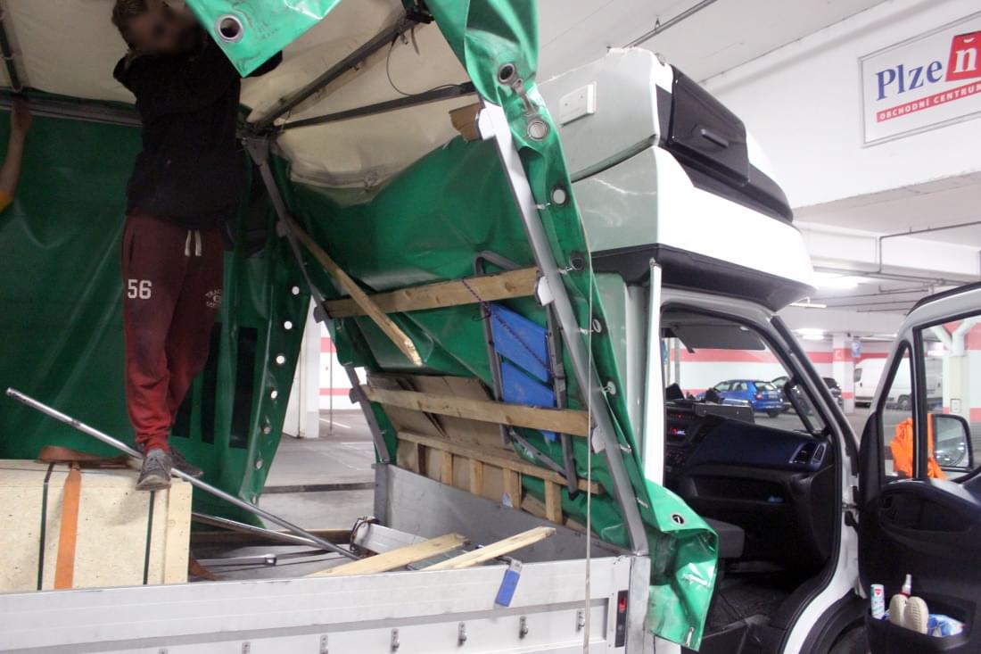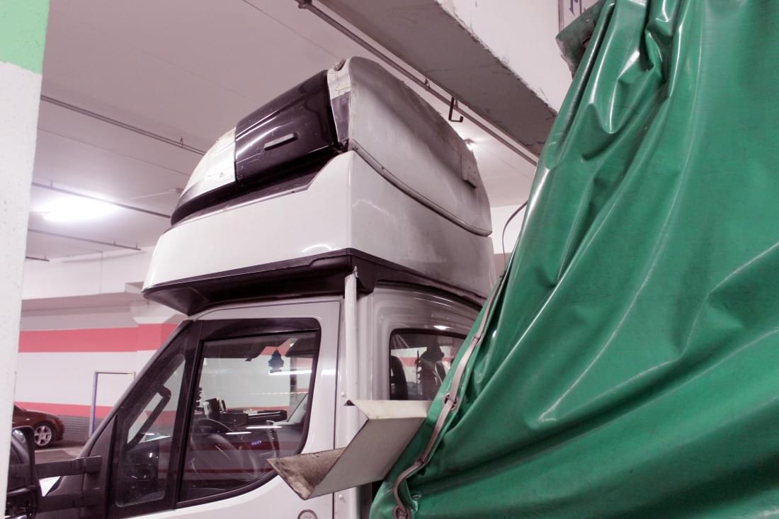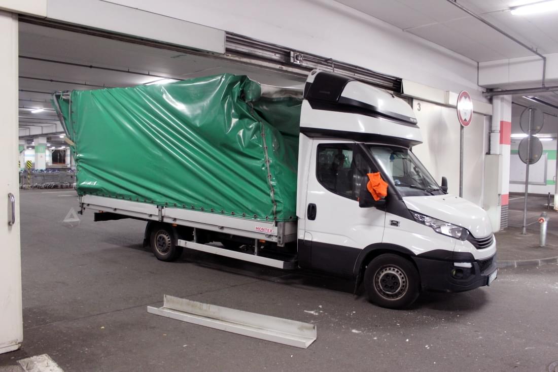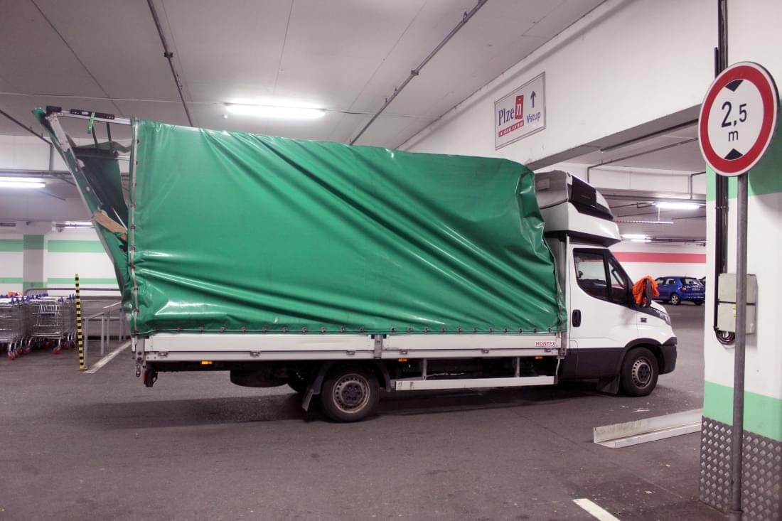 Mladý řidič dodávky Iveco Daily s plachtou zde poněkud zazmatkoval, při projíždění garáží si spletl průjezdy, a místo 3,9 metru vysokým průjezdem vjel do vedlejšího, jen 2,5 metru vysokého průjezdu pro osobní auta. Kabina dodávky se vraty ještě jakž takž protáhla, ale než stačil mladík zabrzdit, narazil do překladu vrat konstrukcí plachtové nástavby. Ta se nárazem ohnula a poškodila a dodávka zůstala ve vratech uvězněna. Cestě dopředu bránila konstrukce nástavby, vycouvání zase o pár centimetrů přečnívající kabina.