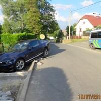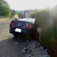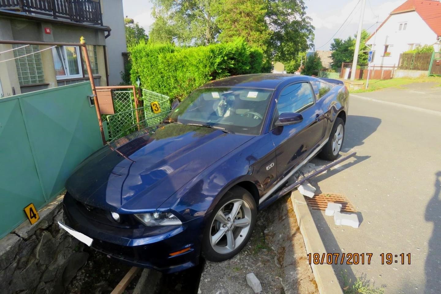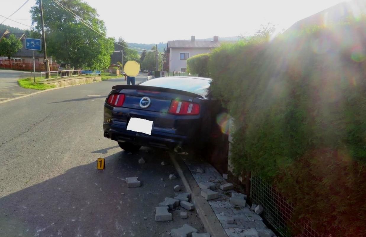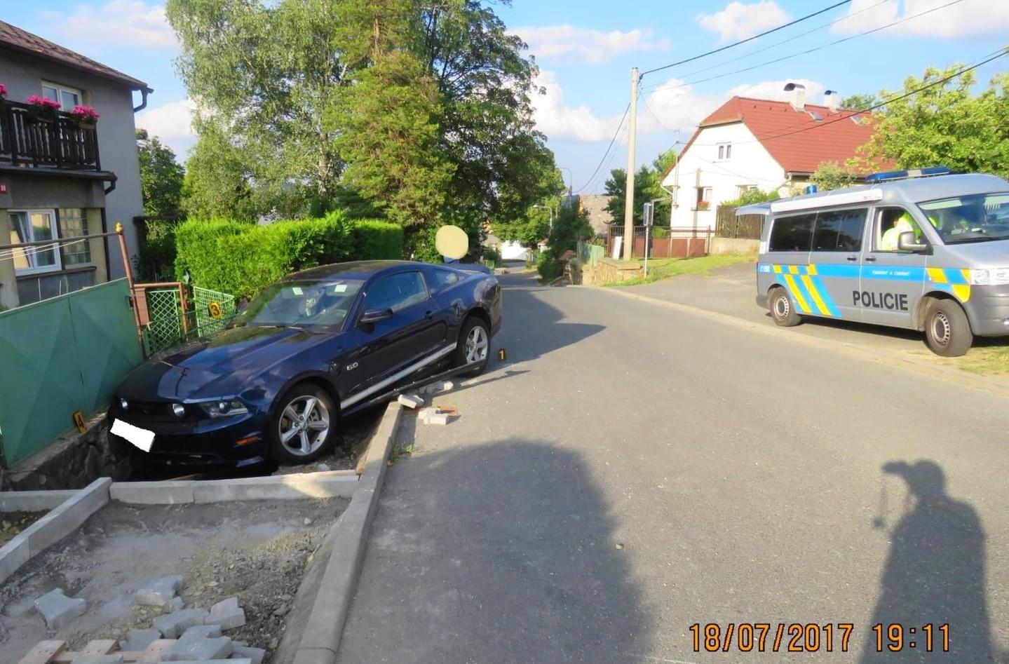 Pětasedmdesátiletý řidič osobního automobilu tovární značky Ford Mustang jel ve směru na Výhledy, když ho podle jeho vlastního vyjádření oslnilo slunce, nestačil zastavit, narazil bokem do palety se zámkovou dlažbou u pravého okraje komunikace, přejel vpravo přes chodník a vjel do výkopu před vraty domku.
