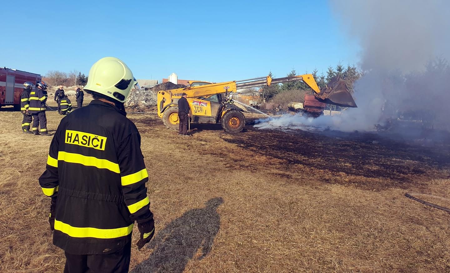 Na místo okamžitě po nahlášení požáru vyjely jednotky profesionálních i dobrovolných hasičů. Jako první dorazili hasiči z SDH Chříč a okamžitě začali hasit dvěma C proudy a zároveň zajišťovali odříznutí ohně od traktorového vozu, aby ho plameny zcela nezničili.