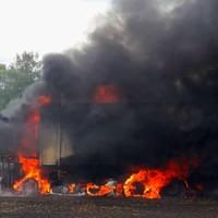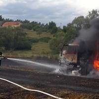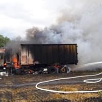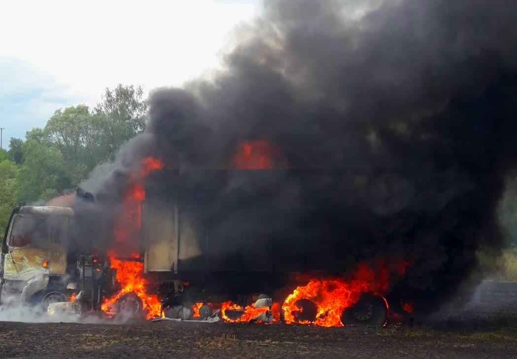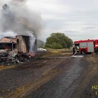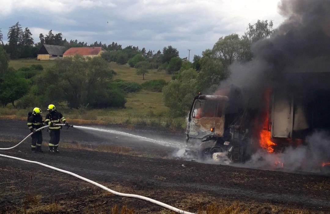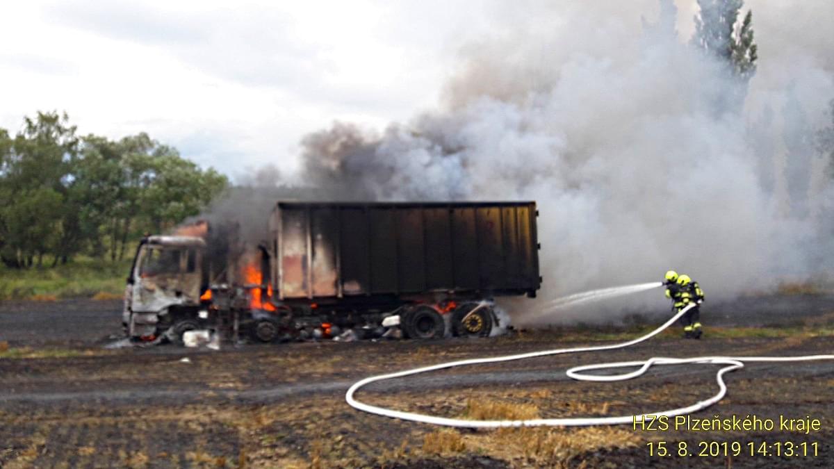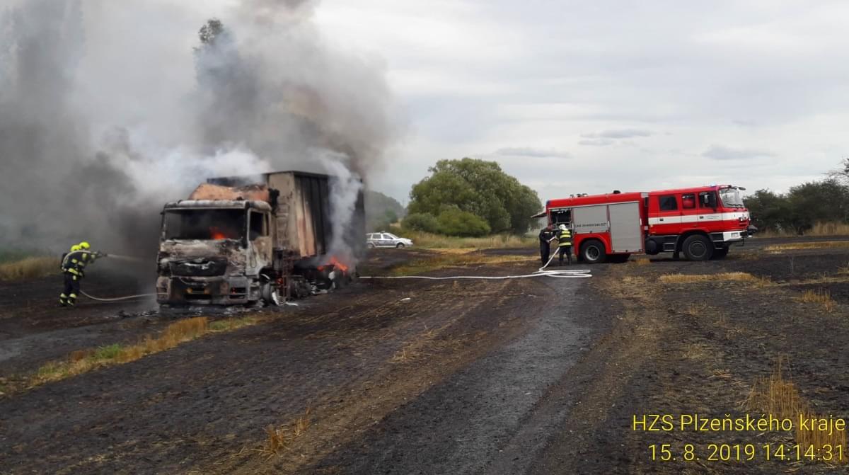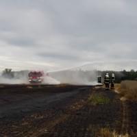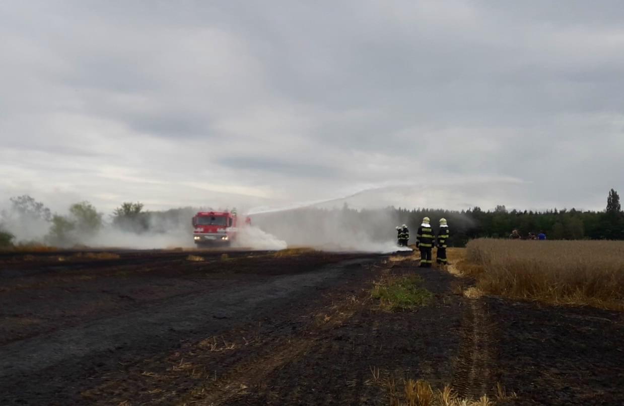 Hasiči ze stanic Nýřany, Stříbro, JSDH Nýřany a JSDH Bdeněnves právě zasahují u požáru na poli u Pňovan, kde začal hořet nákladní automobil s obilím a od něj se oheň rozšířil i na okolní pole.