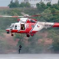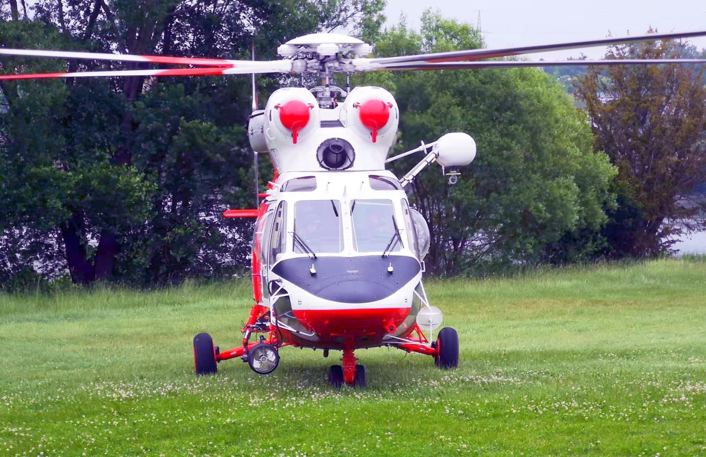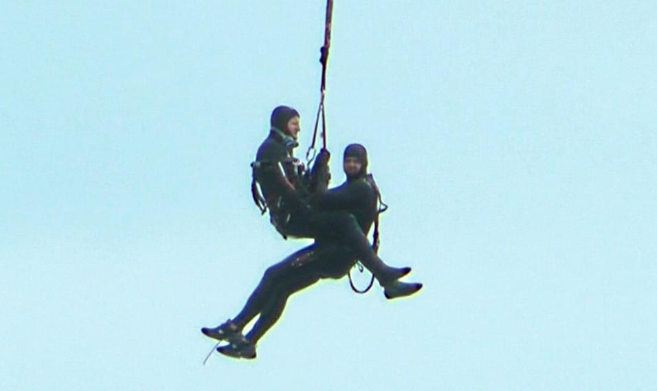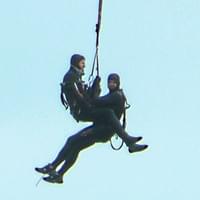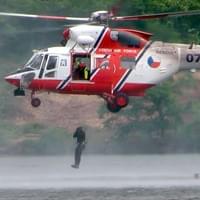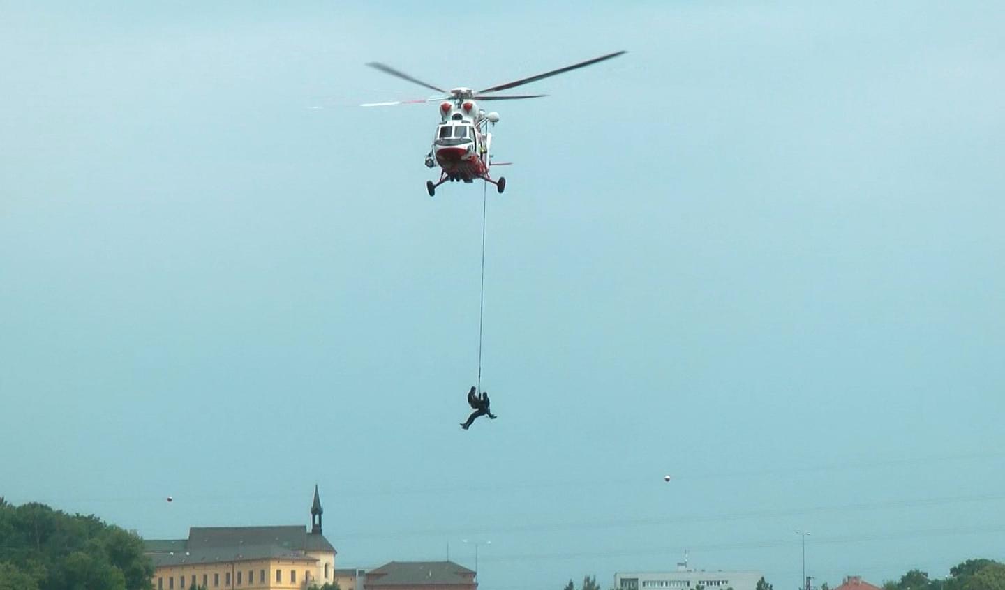Dopolední program cvičení spočíval v záchraně pomocí lana, kdy k zachraňovanému z vrtulníku seskočí do vody hasič lezec a následně se společně s ním připne na lano palubního jeřábu vrtulníku. Pilot poté oba v závěsu pod vrtulníkem přenese na břeh, kde je možné pokračovat v záchranných pracích.