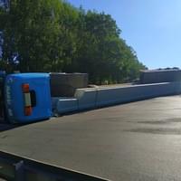 Dnes po sedmé hodině ráno došlo ve Svojkovicích na odbočce na Volduchy k havárii teleskopické nákladní soupravy, převážející třináctimetrový betonový nosník na stavbu nové haly ve firmě Borgers.