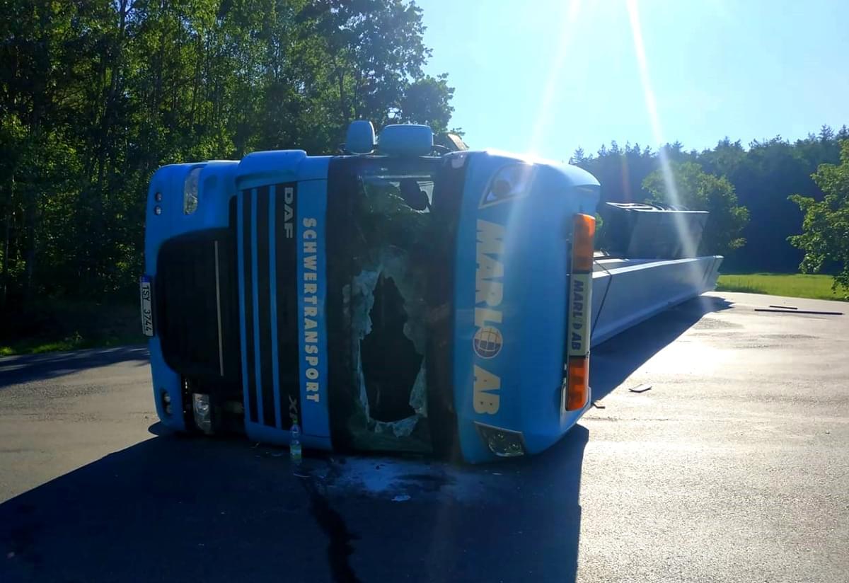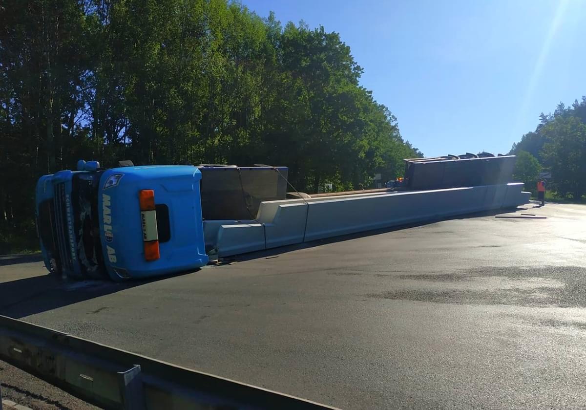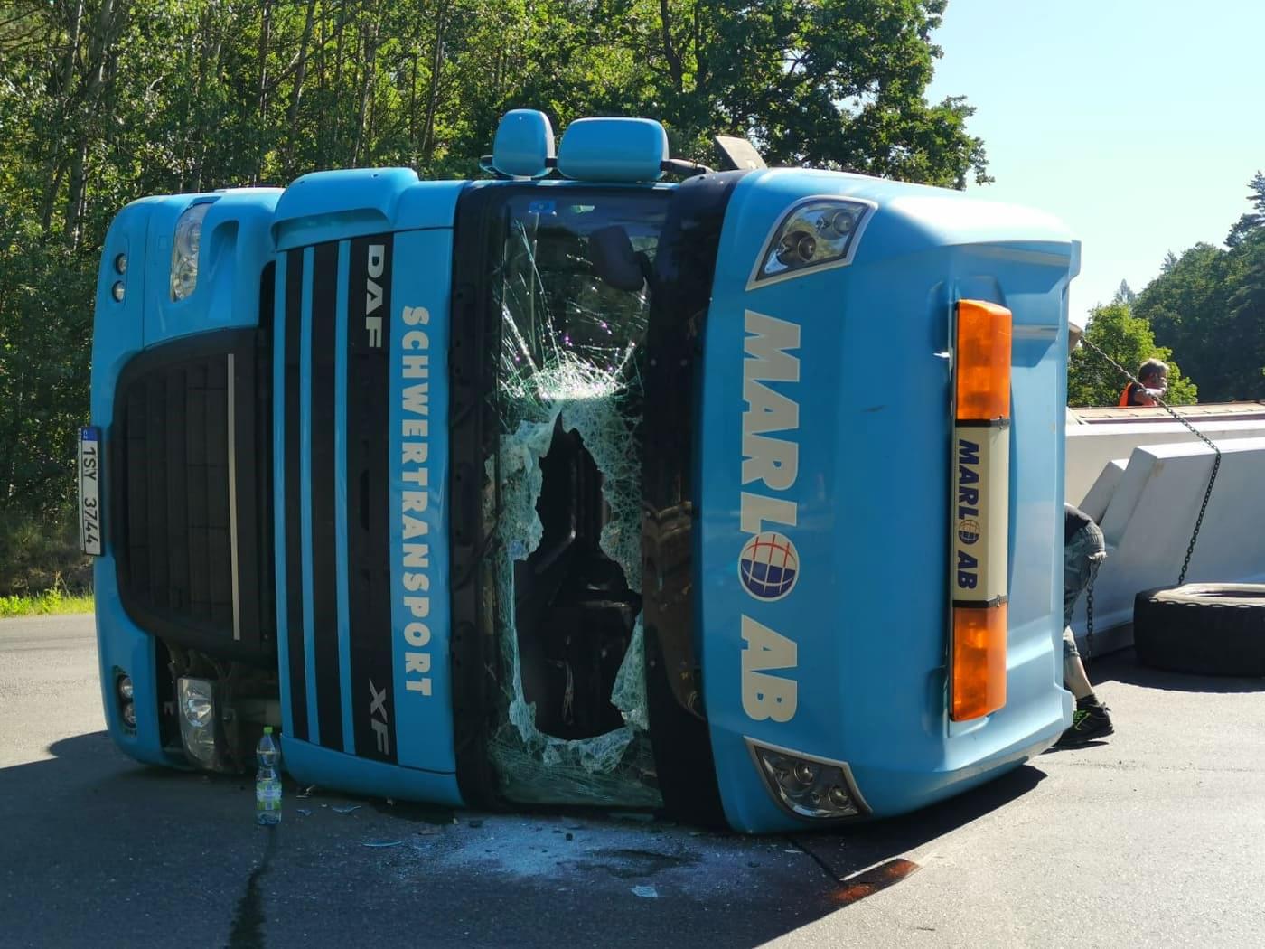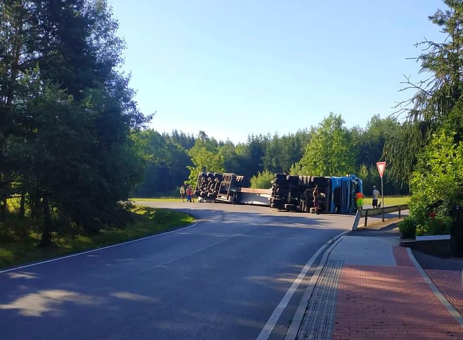 "Řidič narozený v roce 1972 jel od Holoubkova na Volduchy, při odbočení na křižovatce nepřizpůsobil rychlost a se soupravou se převrátil na bok. Dechová zkouška vyšla u řidiče s negativním výsledkem a byl na místě vyřešen v příkazním řízení," uvedla tisková mluvčí policie.