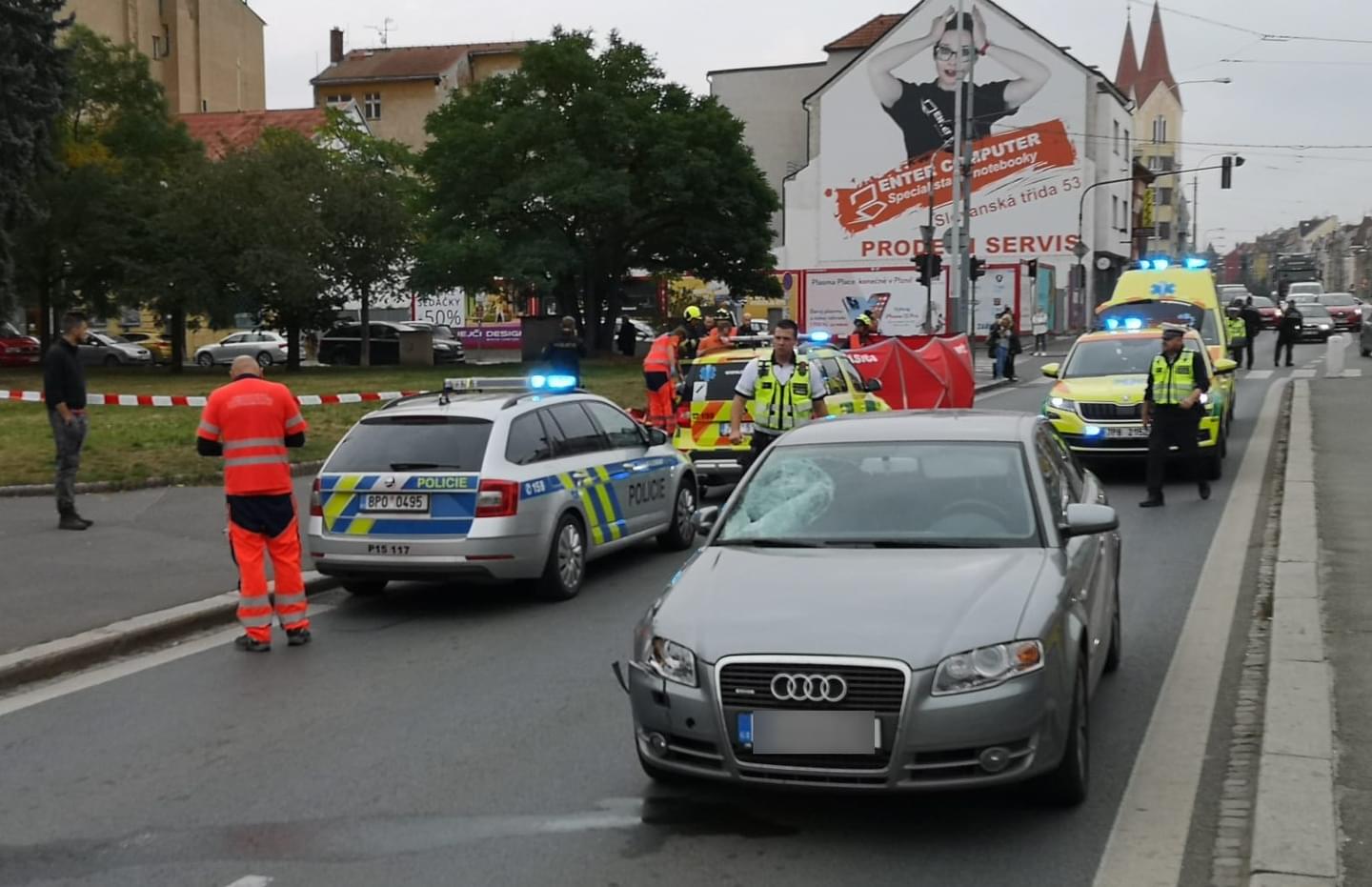 Dnes těsně před polednem došlo na Klatovské třídě v Plzni, na úrovni tramvajové zastávky Masarykovo náměstí, k tragické dopravní nehodě, při které osobní automobil Audi jedoucí ve směru do centra smetl chodkyni. Podle svědků velmi mladá dívka přebíhala mimo přechod od náměstí na zastávku, kde snažila dohnat tramvaj.