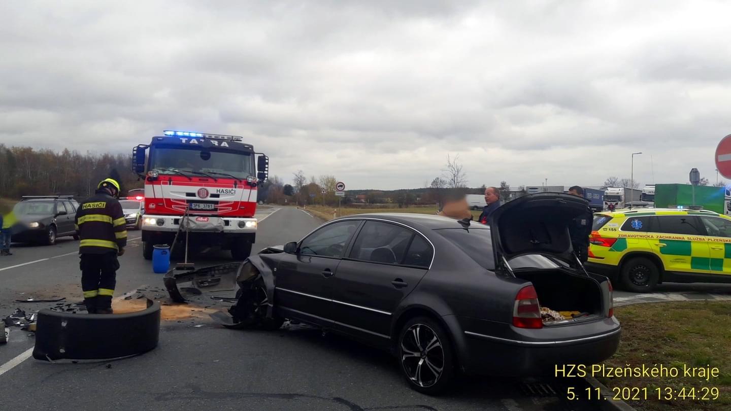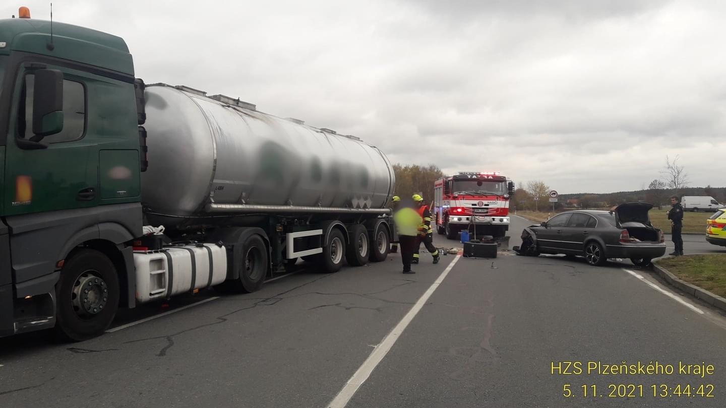 Dnes kolem půl druhé odpoledne došlo na výjezdu z Nýřan na Blatnici k dopravní nehodě, když se přímo u čerpací stanice ONO střet osobní vůz Škoda s cisternou převážející olej. "Řidič vozu Škoda Superb narozený v roce 1997 jel ve směru na Nýřany, nevěnoval se plně řízení a přehlédl cisternu Mercedes Benz, která zrovna vyjela od čerpací stanice," popsala tisková mluvčí policie.