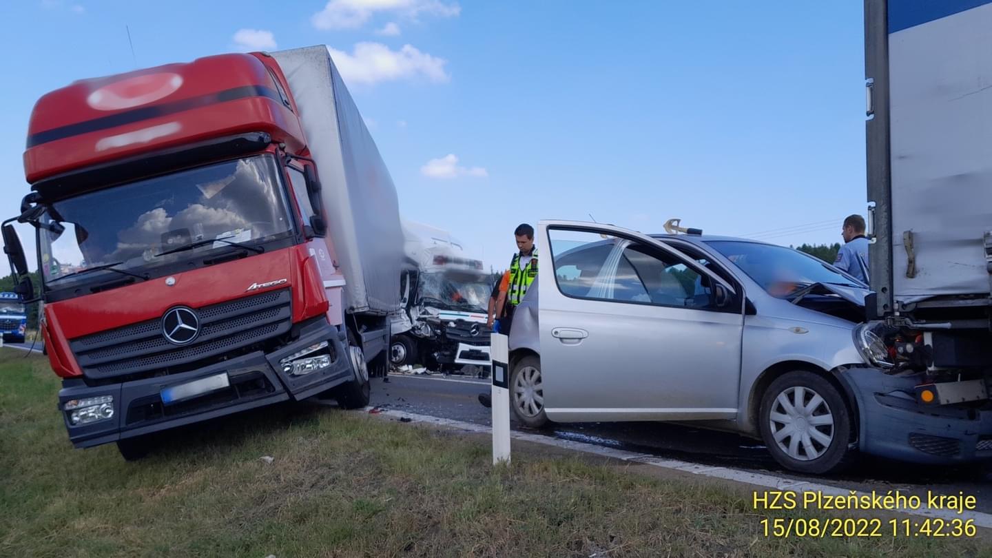 Dnes krátce po půl dvanácté dopoledne došlo na silnici číslo 20 mezi Plzní a Losinou k dopravní nehodě, při které se střetly tři kamiony a osobní automobil. Z místa bylo hlášeno možné zranění několika osob a k nehodě proto vyrazily všechny záchranné složky.