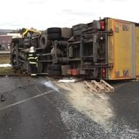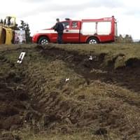 Dnes kolem půl deváté ráno došlo na výjezdu z Plané na Černošín ke střetu kamionu a bagru, následkem kterého se kamion převážející stavební materiál převrátil na bok a bagr skončil mimo silnici.