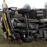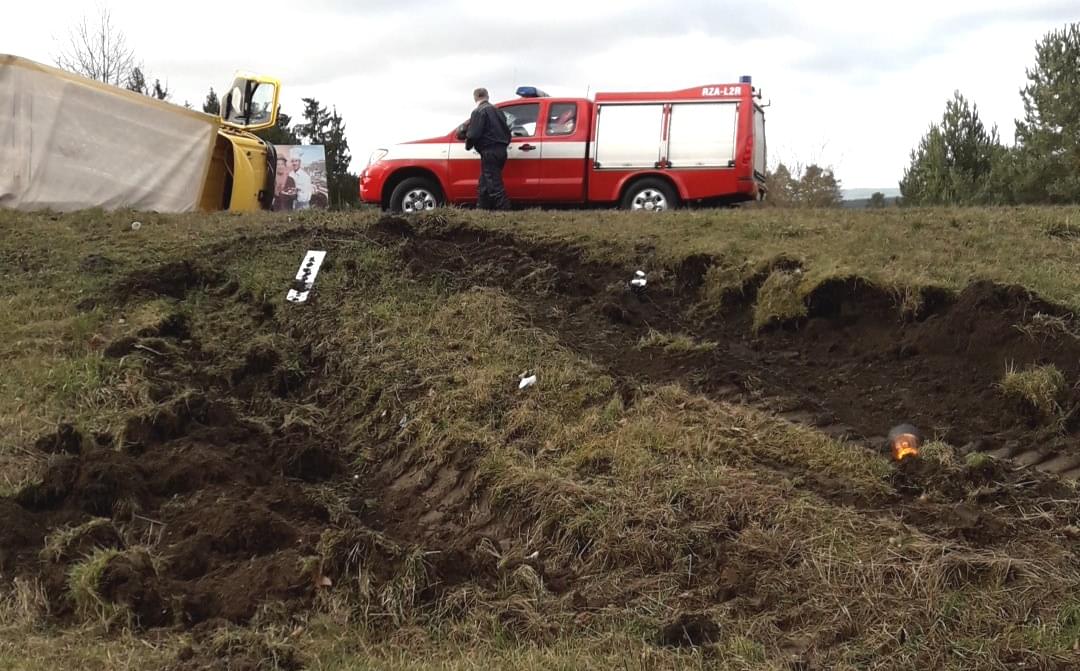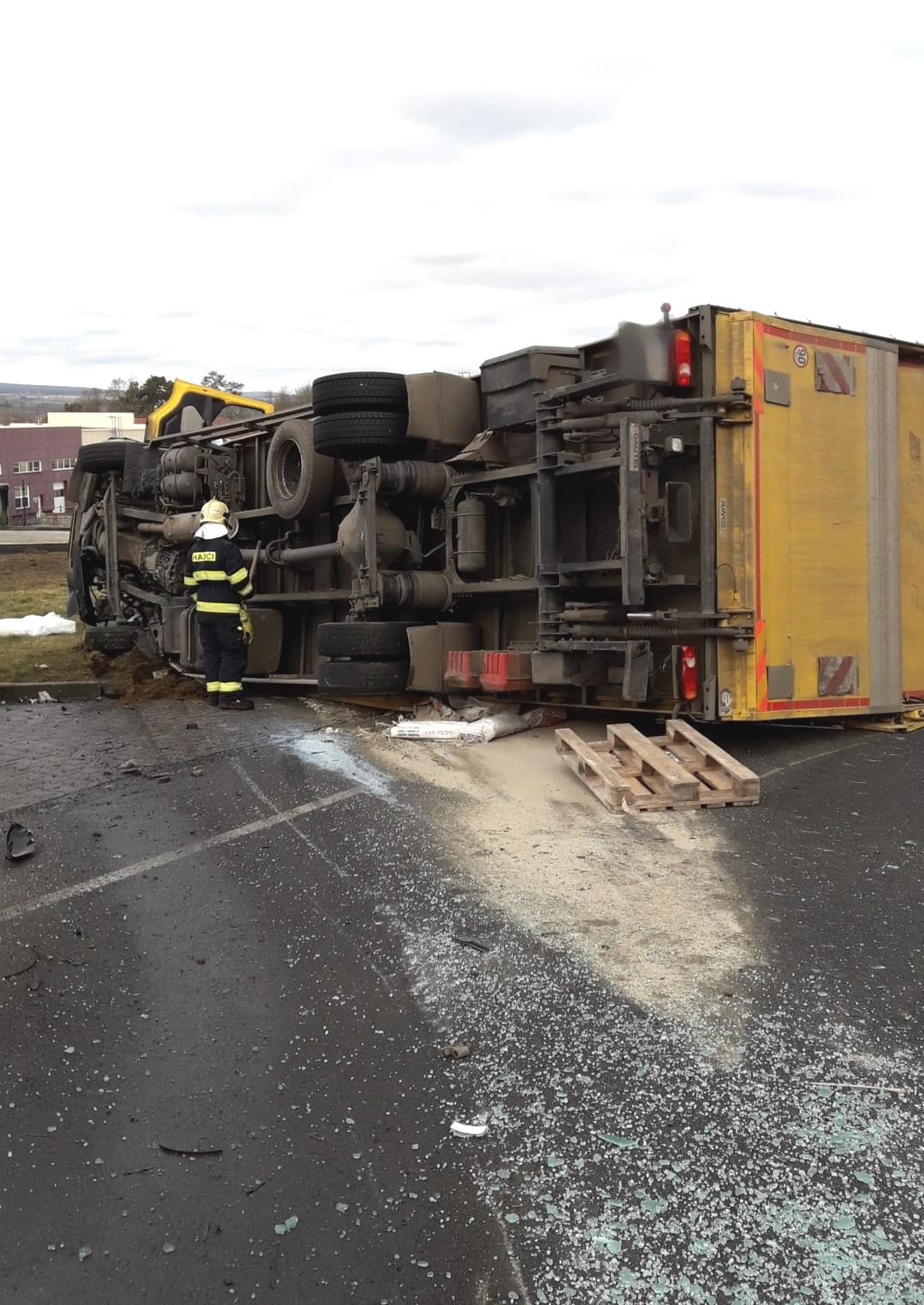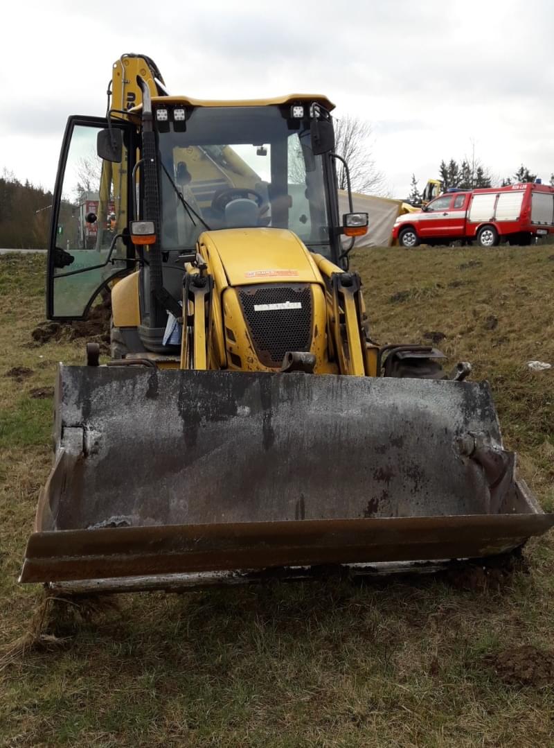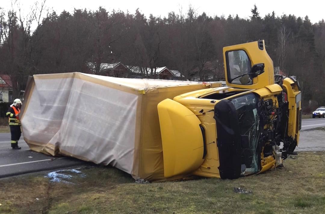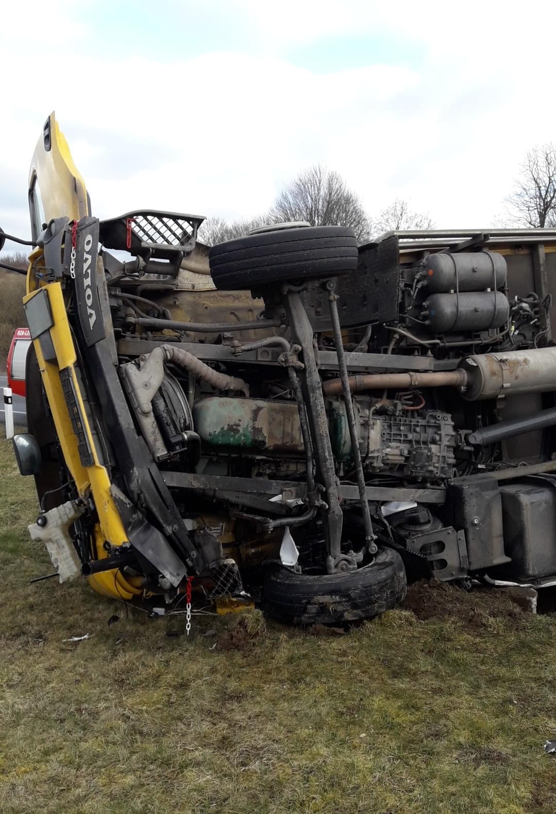 Řidič nákladního auta se snažil střetu s traktorbagrem zabránit, a tak strhl řízení vozidla vlevo, částí auta vyjel mimo komunikaci, kde se nákladní vůz převrátil na pravý bok.