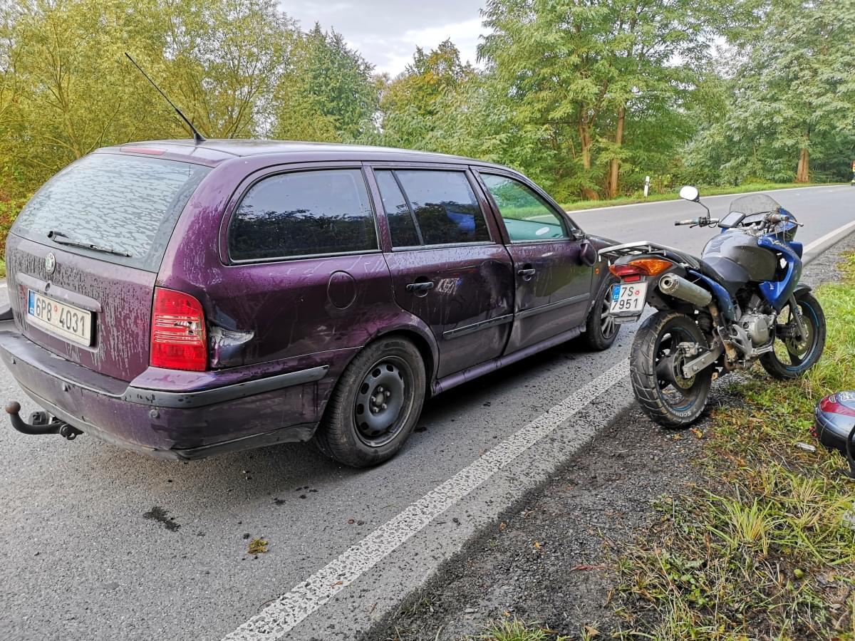 V neděli před polednem došlo na silnici mezi Borem a Stráží na Tachovsku ke kuriózní dopravní nehodě. Čtyřiadvacetiletá řidička vozidla značky Škoda zareagovala na situaci na vozovce, konkrétně na kachny přecházející vozovku, a začala brzdit. Bohužel za ní jedoucí šestnáctiletý motocyklista na stroji Yamaha, který nedodržel bezpečnou vzdálenost za jejím autem, již nestihl zareagovat a do vozu narazil, přičemž přeletěl řídítka a spadl na vozovku.