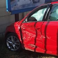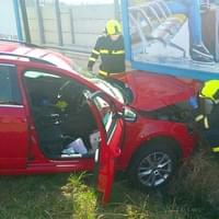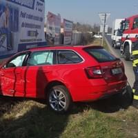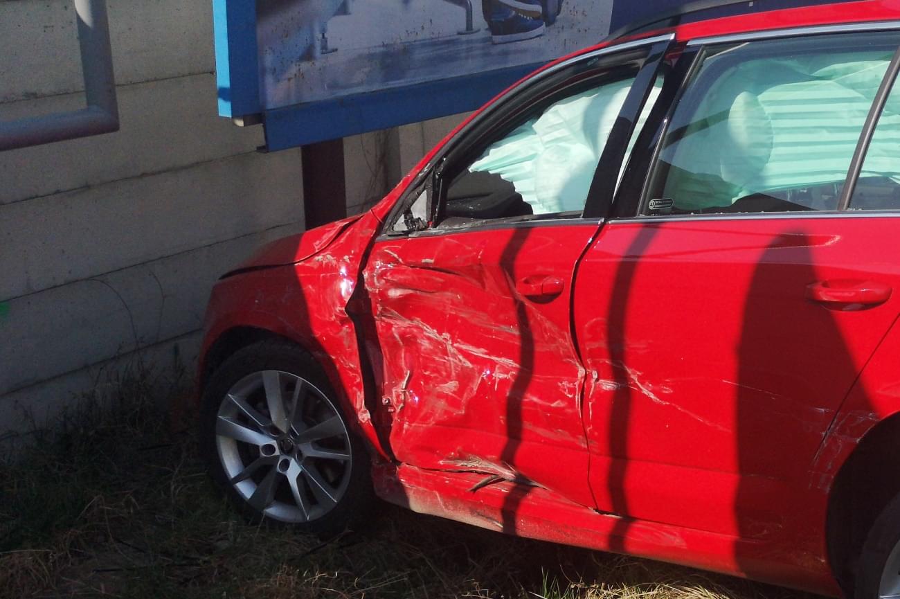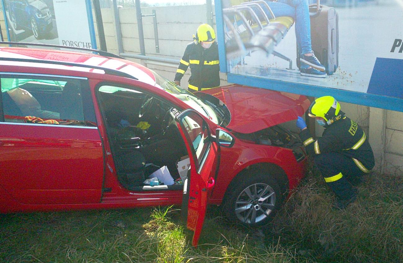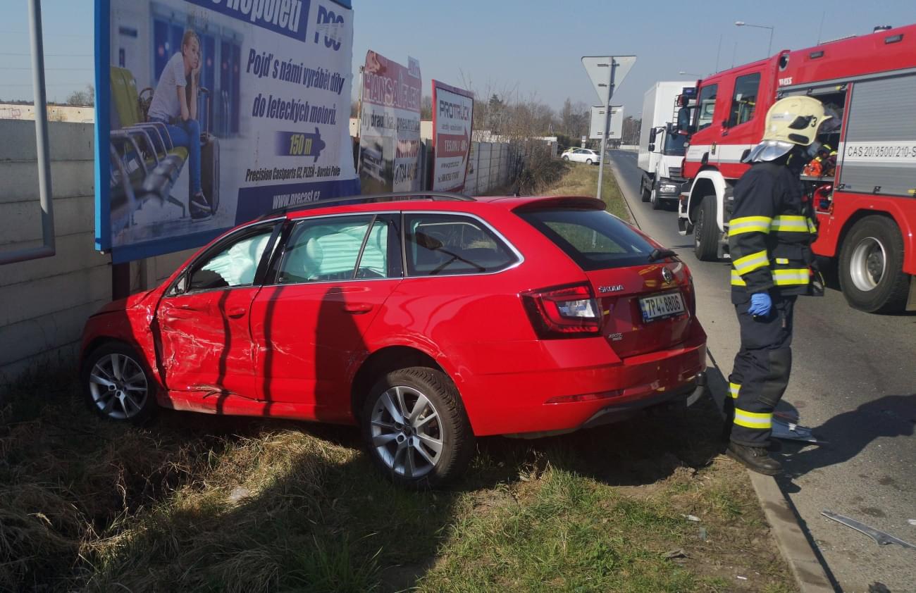 Náraz škodovku odmrštil mimo silnici do příkopu, kde skončila s vystřelenými airbagy v betonové zdi pod billboardem.