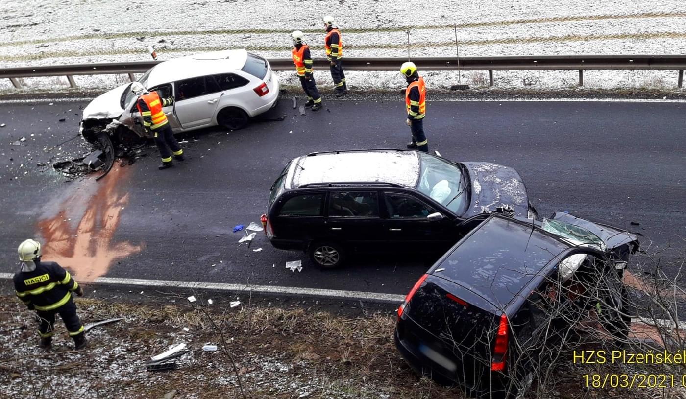Z místa bylo hlášeno několik zraněných, takže k nehodě vyjely všechny záchranné složky. Hasiči provedli zajištění místa nehody i protipožární opatření a z vozů vyprostili dva zraněné, které předali do péče záchranářům. "My z místa transportujeme muže narozeného v roce 1981 do Fakultní nemocnice Plzeň Lochotín. Ženu narozenou v roce 1998 a muže v roce 1989 pak s lehčími zraněními do nemocnice Stod," uvedli nám záchranáři.