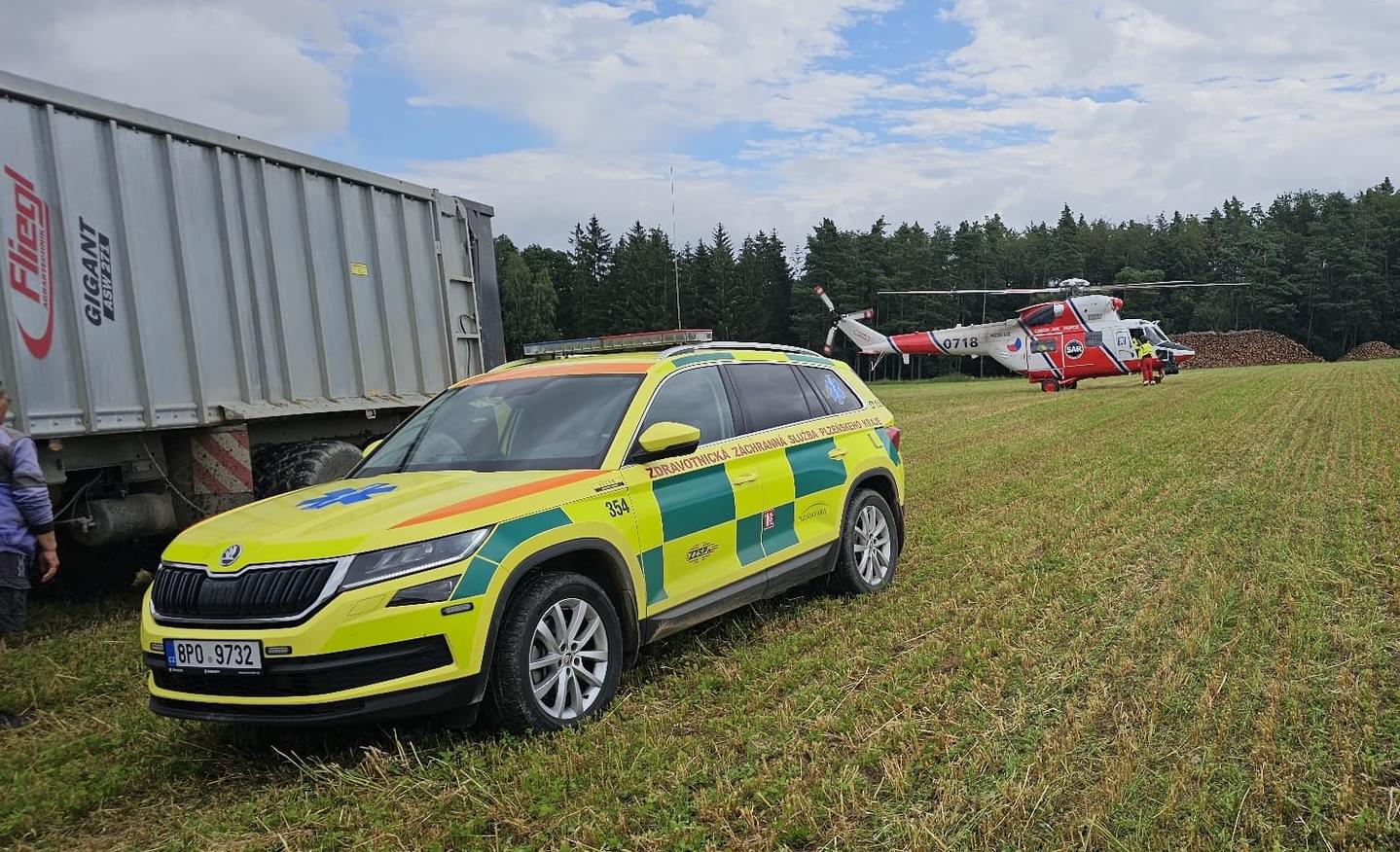 Z místa bylo hlášeno, že zde pracovní stroj muži usekl ruku, takže byl na místo povolán i vrtulník letecké záchranné služby z letiště v Líních.