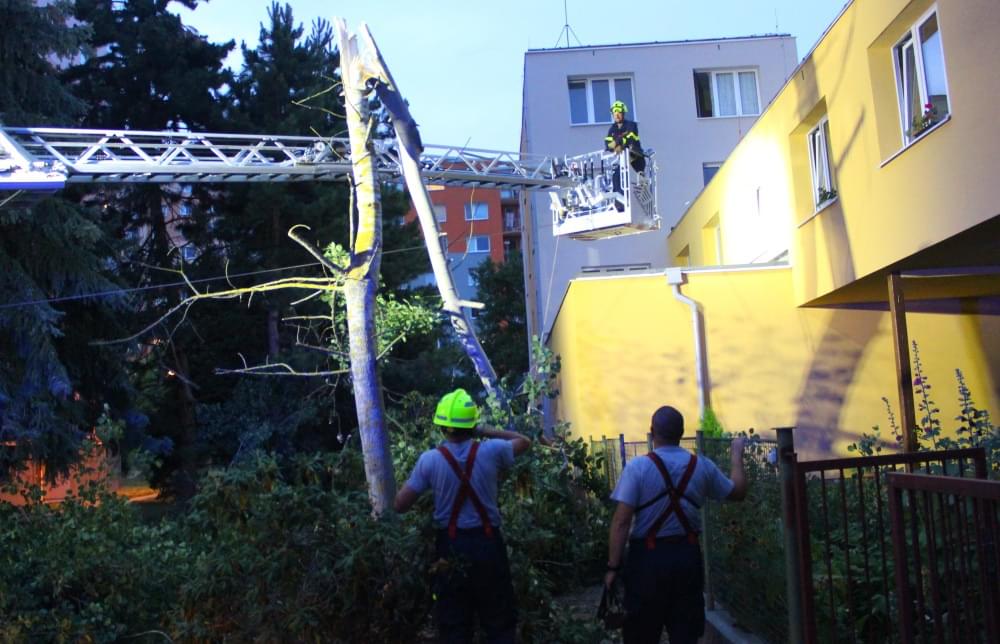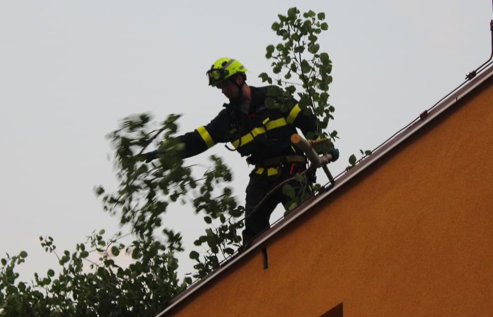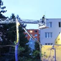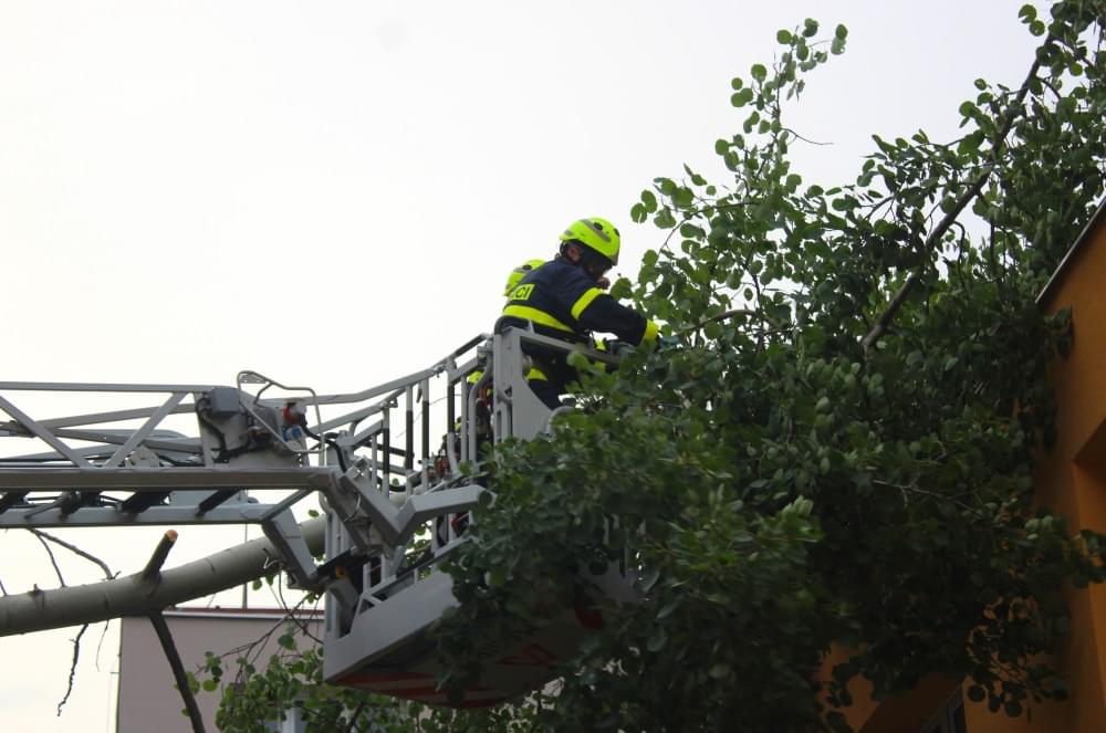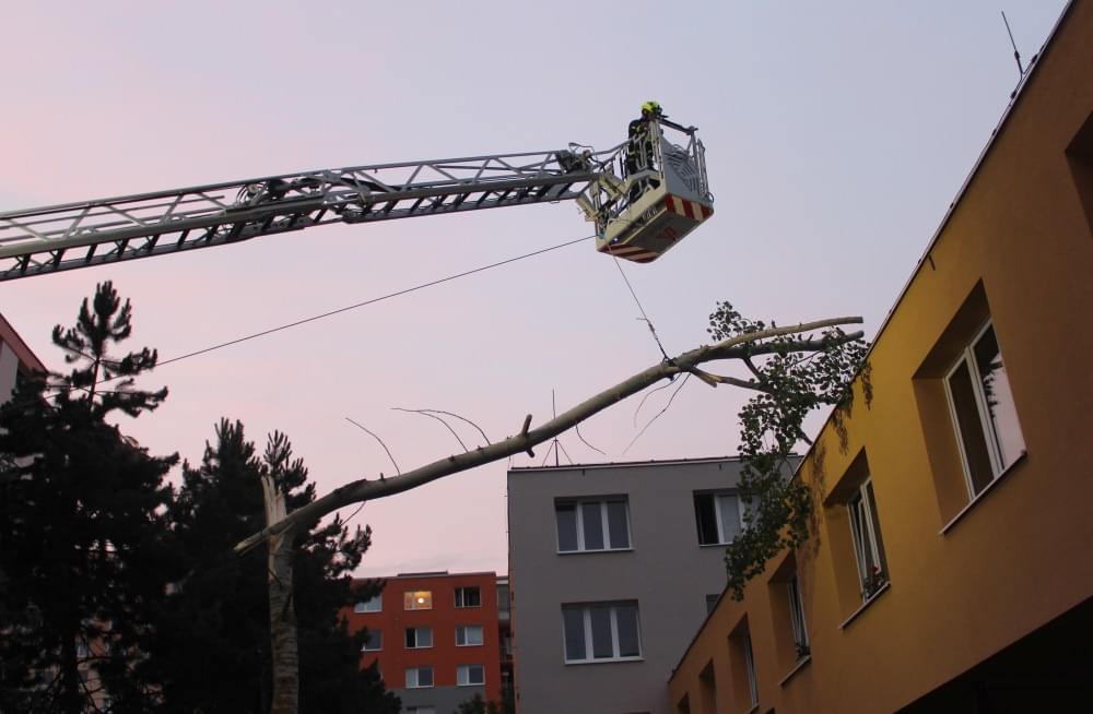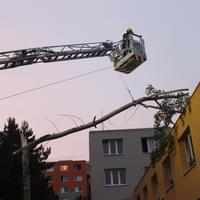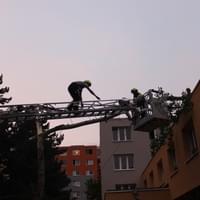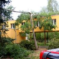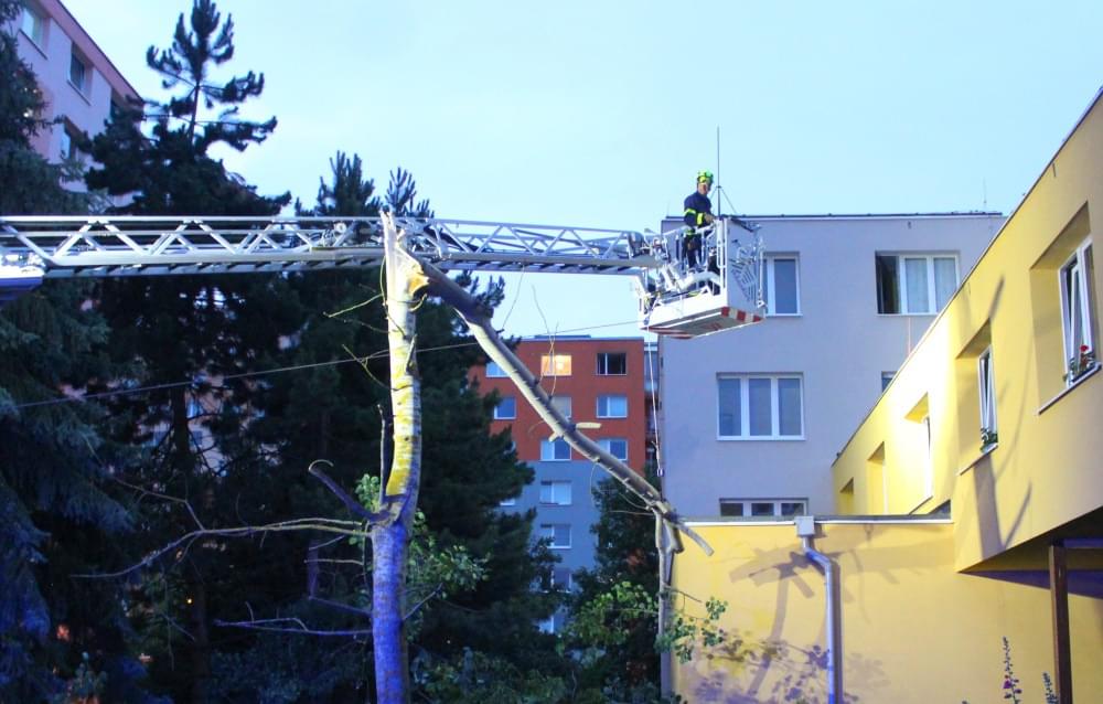 Dnešní slibovaná bouřka Plzeň obešla, silné poryvy větru však nikoli a tak hasiči dnes večer vyjížděli na pomoc k několika popadaným stromům. V půl deváté večer vyjížděli i do ulice U Jam na Lochotíně, kde prudký závan větru rozlomil listnatý strom. Část spadla na vedlejší stříbrný smrk, druhá na střechu Domova pro seniory, přímo nad vchod do zařízení a hrozila dalším pádem.