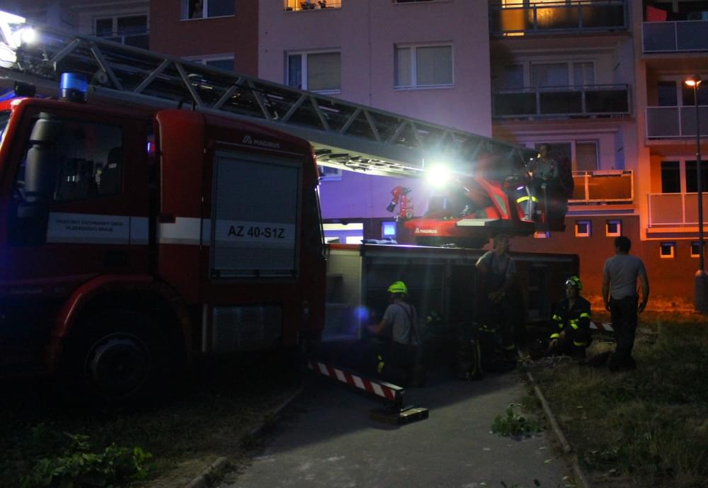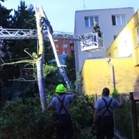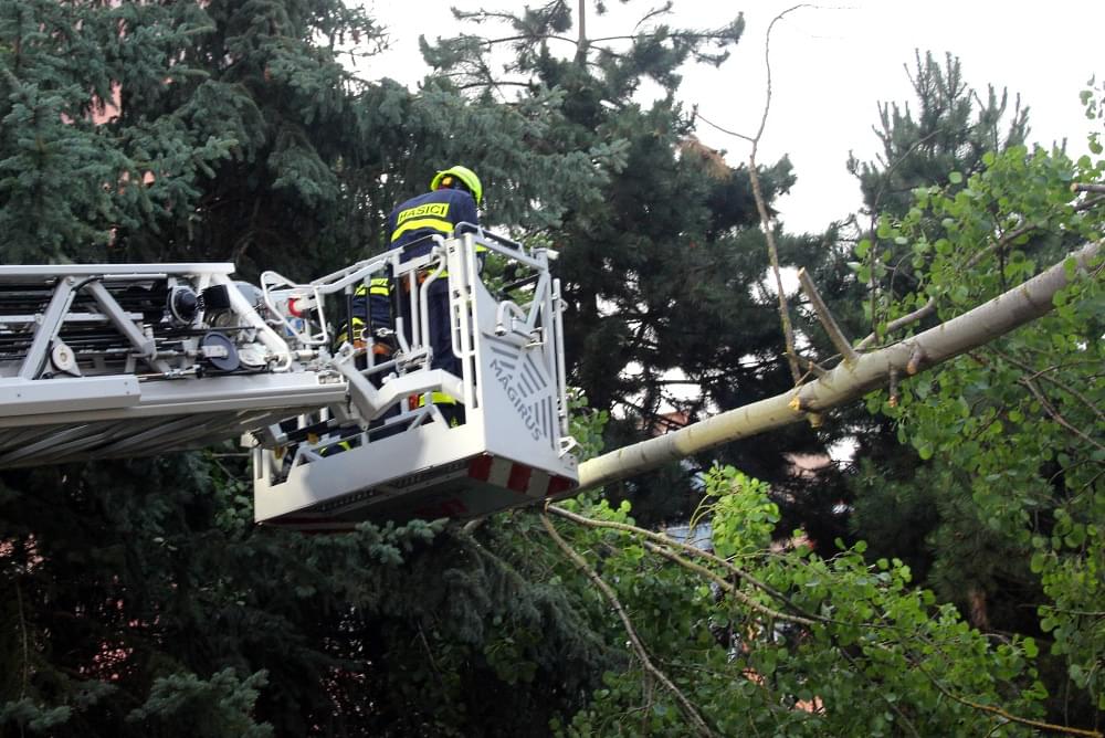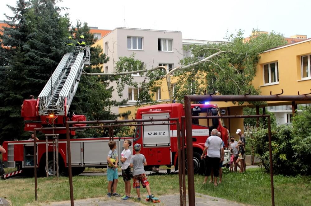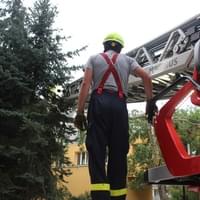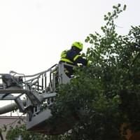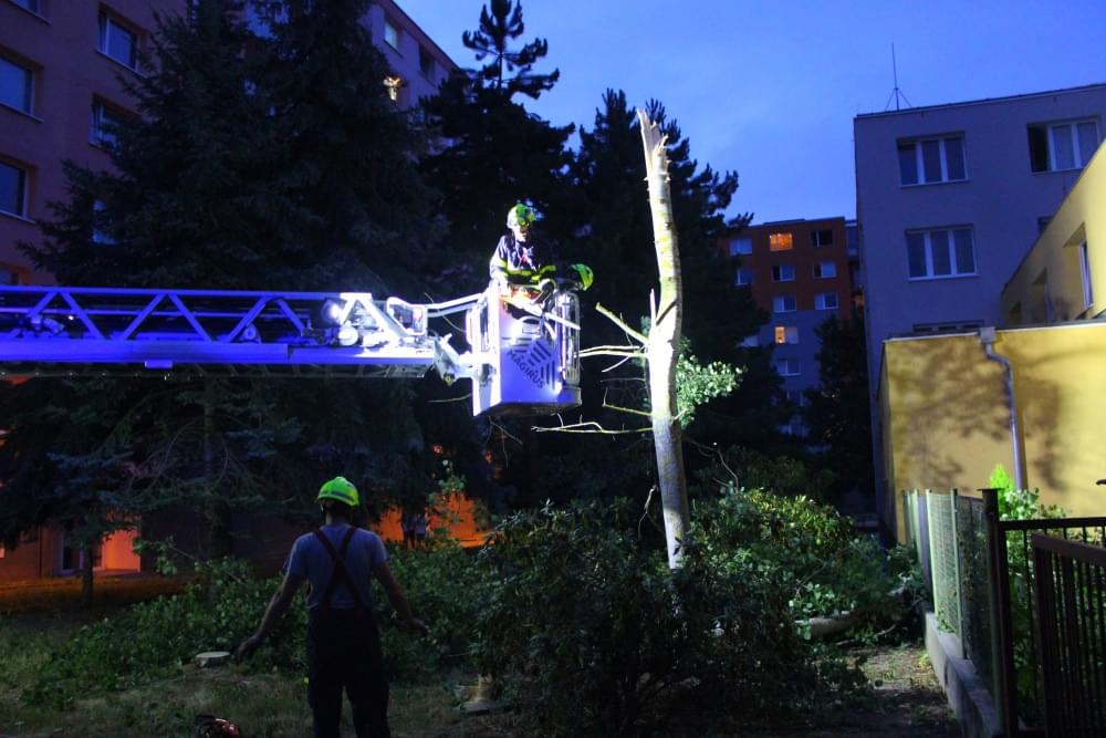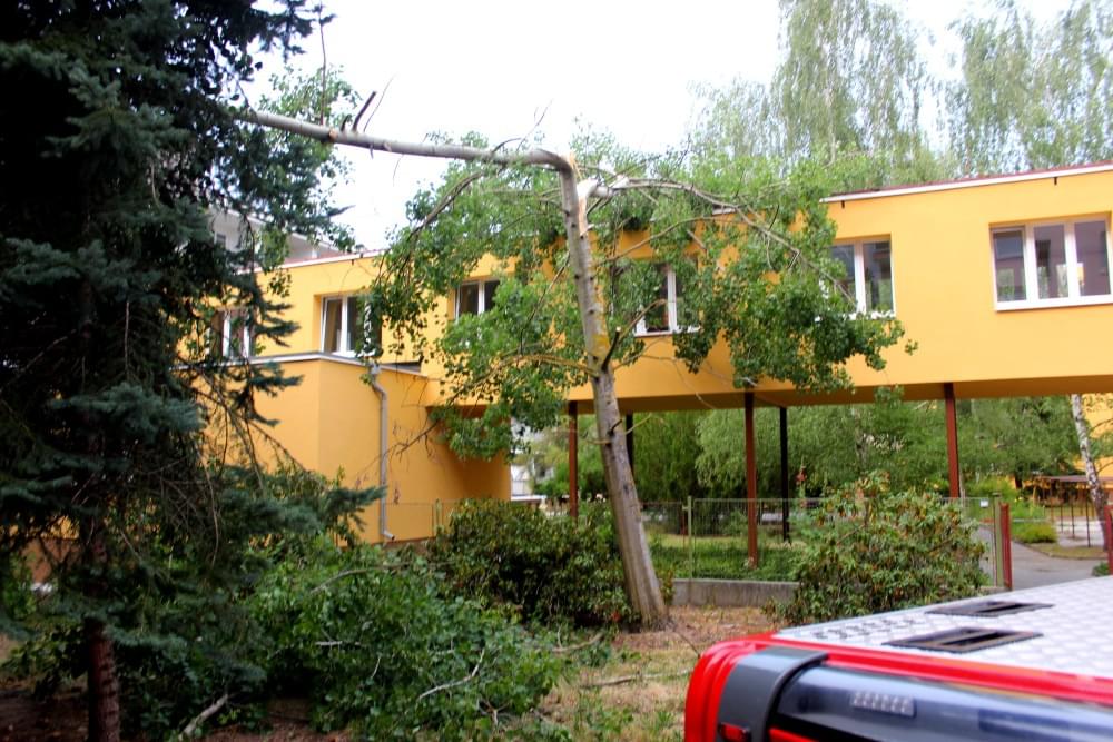 Dnešní slibovaná bouřka Plzeň obešla, silné poryvy větru však nikoli a tak hasiči dnes večer vyjížděli na pomoc k několika popadaným stromům. V půl deváté večer vyjížděli i do ulice U Jam na Lochotíně, kde prudký závan větru rozlomil listnatý strom. Část spadla na vedlejší stříbrný smrk, druhá na střechu Domova pro seniory, přímo nad vchod do zařízení a hrozila dalším pádem.