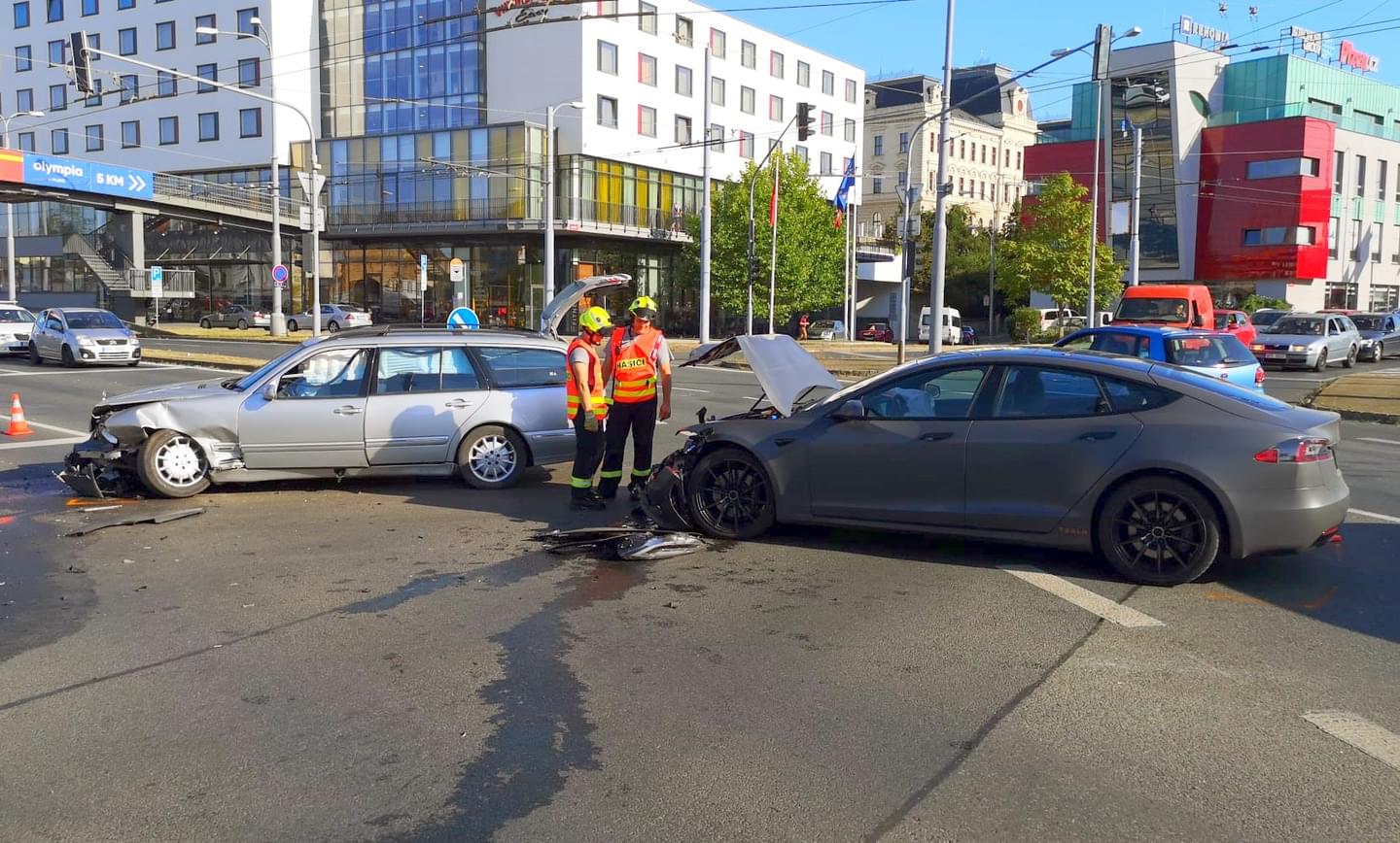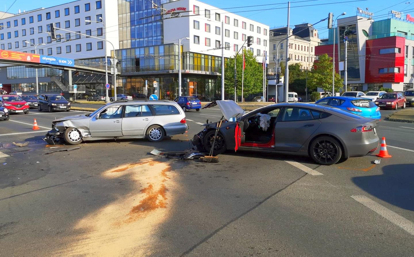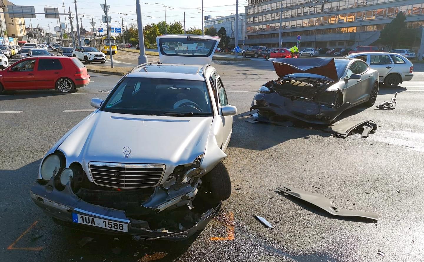 Dnes před čtvrtou hodinou odpoledne došlo na křižovatce ulic U Prazdroje, Sirková, Tyršova a Pražská k dopravní nehodě, při které se střetly dva osobní vozy. Podle informací z místa vjel mladý řidič s Mercedesem do křižovatky ze Sirkové ulice na červenou a narazil do něj řidič s vozem Tesla Model S jedoucí z Tyršovy ulice na zelený signál. Řidič v Mercedesu cestoval sám, v Tesle cestoval řidič se spolujezdkyní.