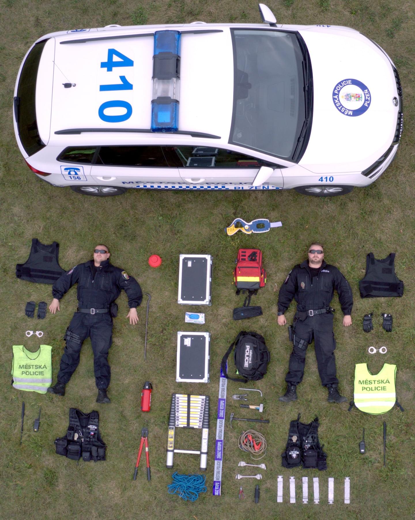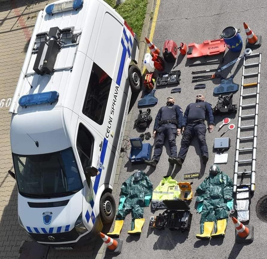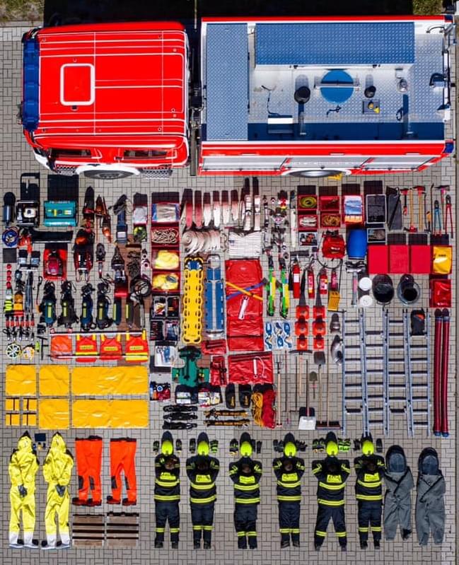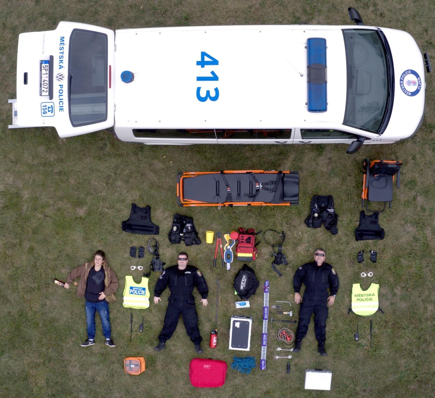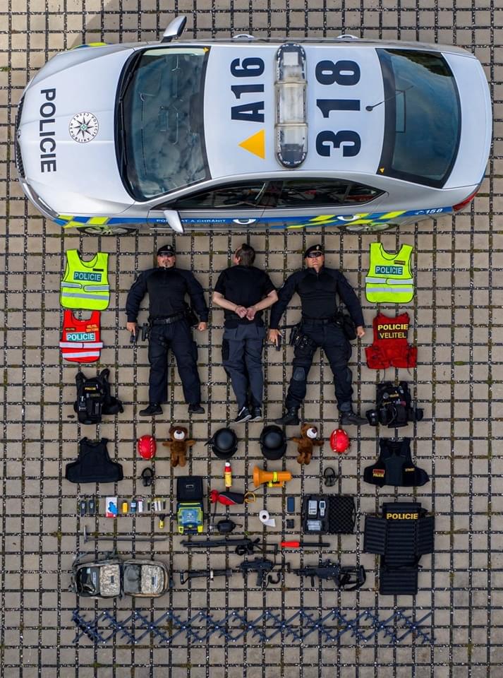 Jedná se o snímek z výšky, často z dronu, na kterém je vedle vozidla vyskládáno a srovnáno veškeré vybavení, mezi kterým leží i posádka.