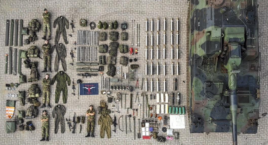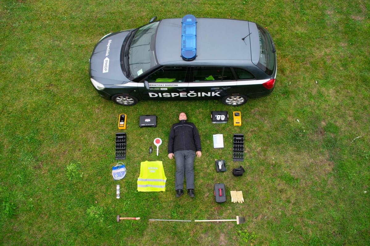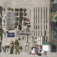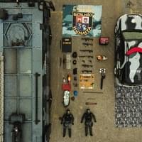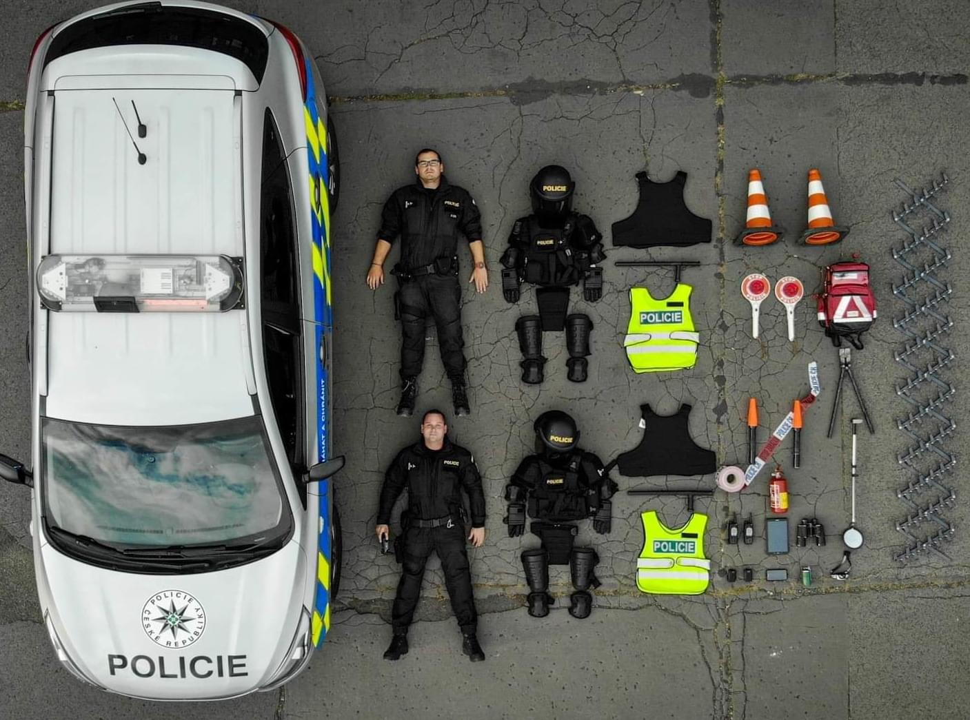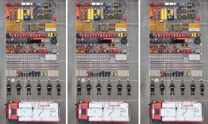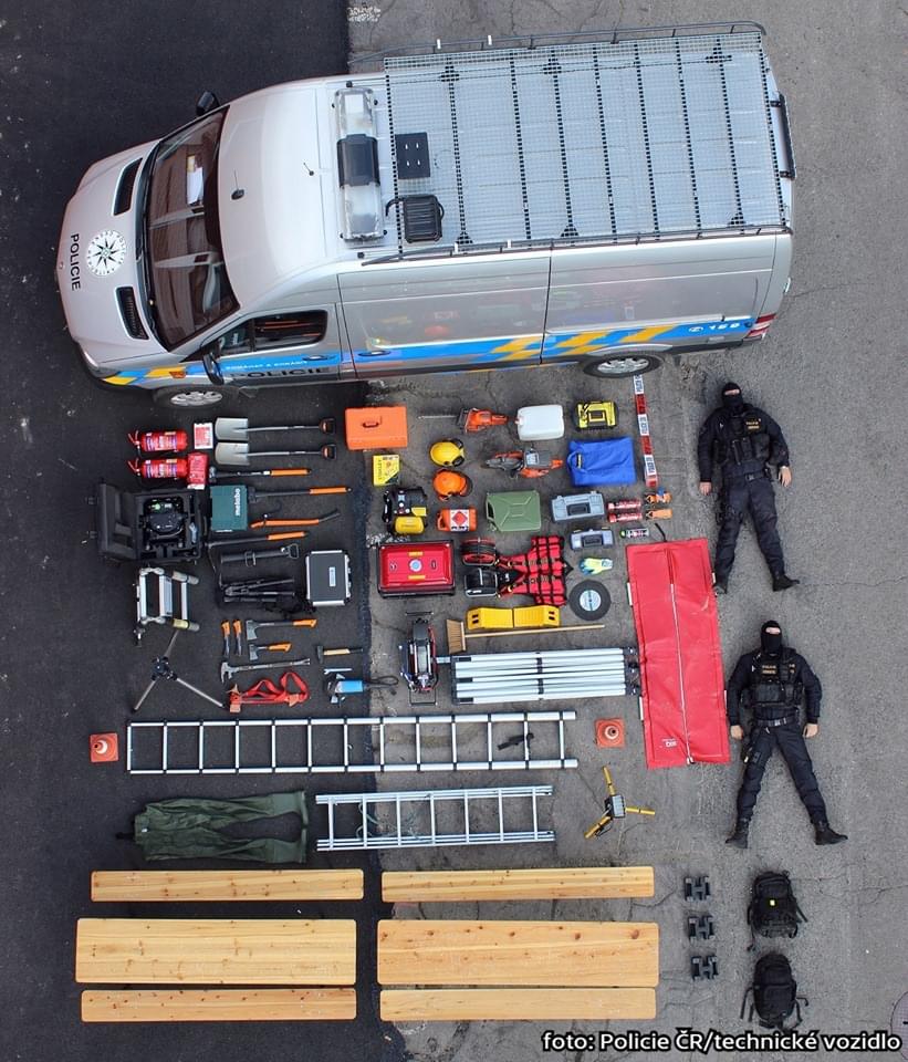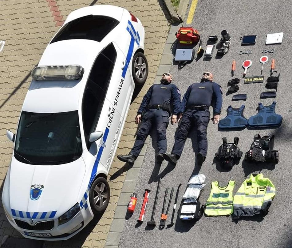 Jedná se o snímek z výšky, často z dronu, na kterém je vedle vozidla vyskládáno a srovnáno veškeré vybavení, mezi kterým leží i posádka.