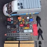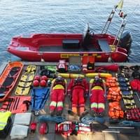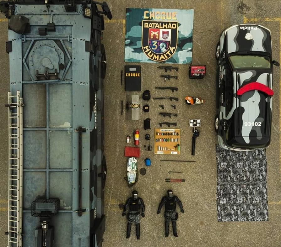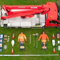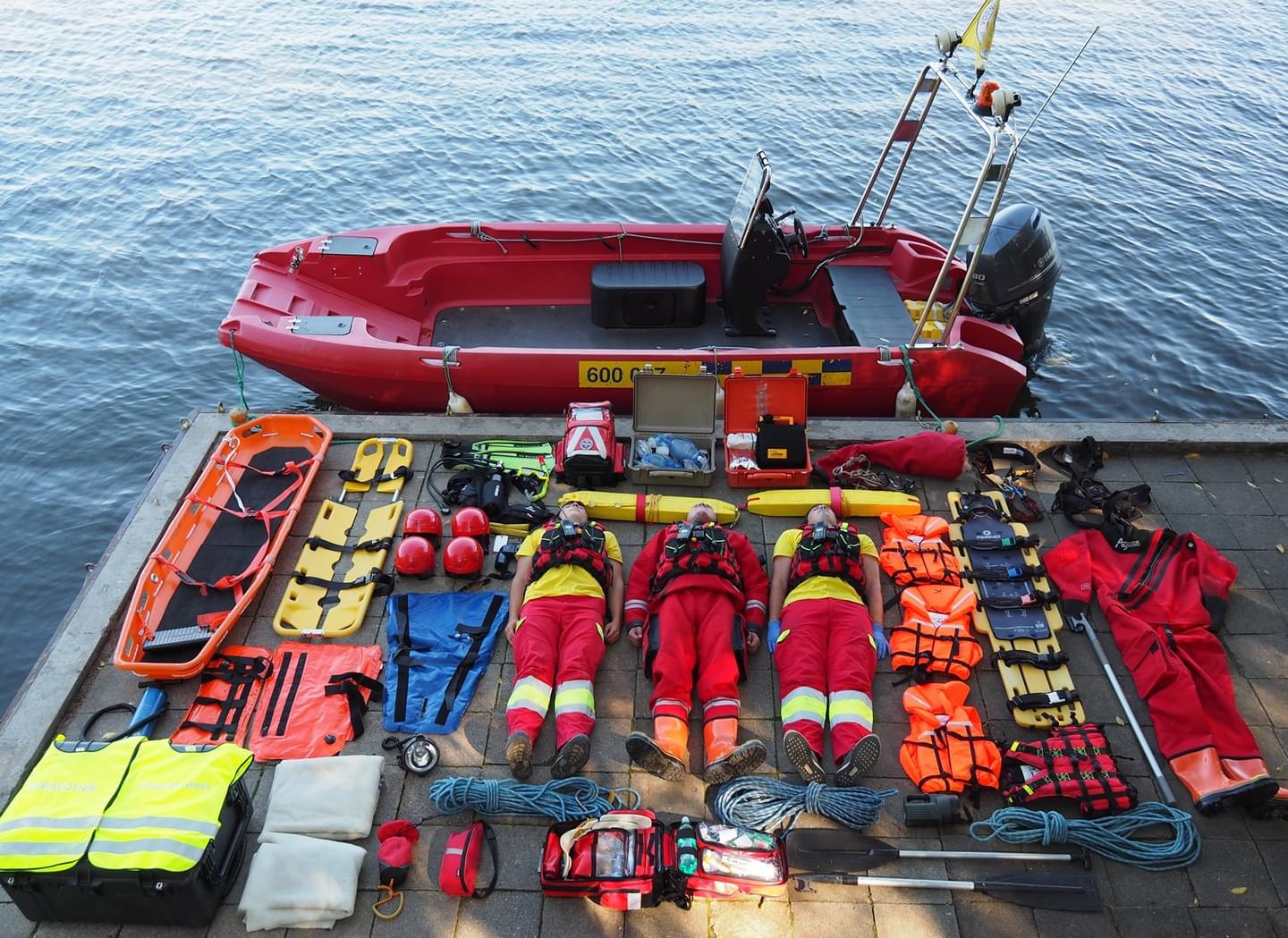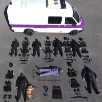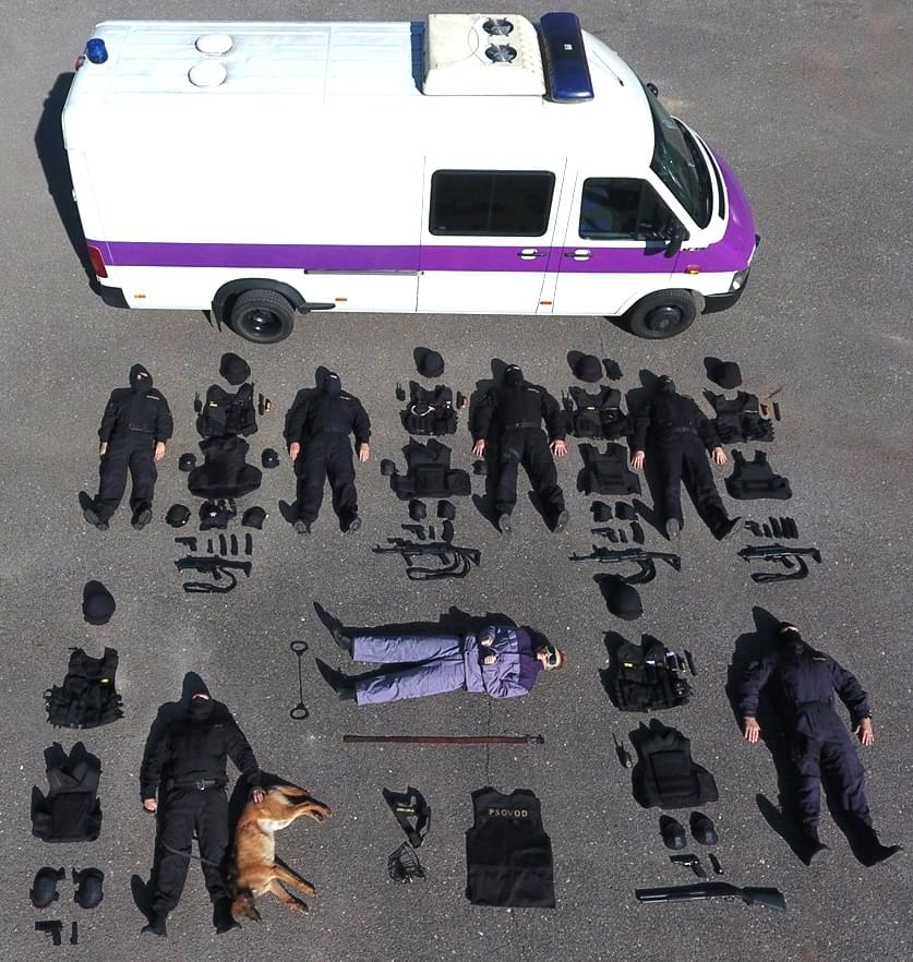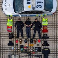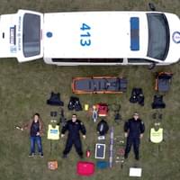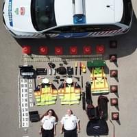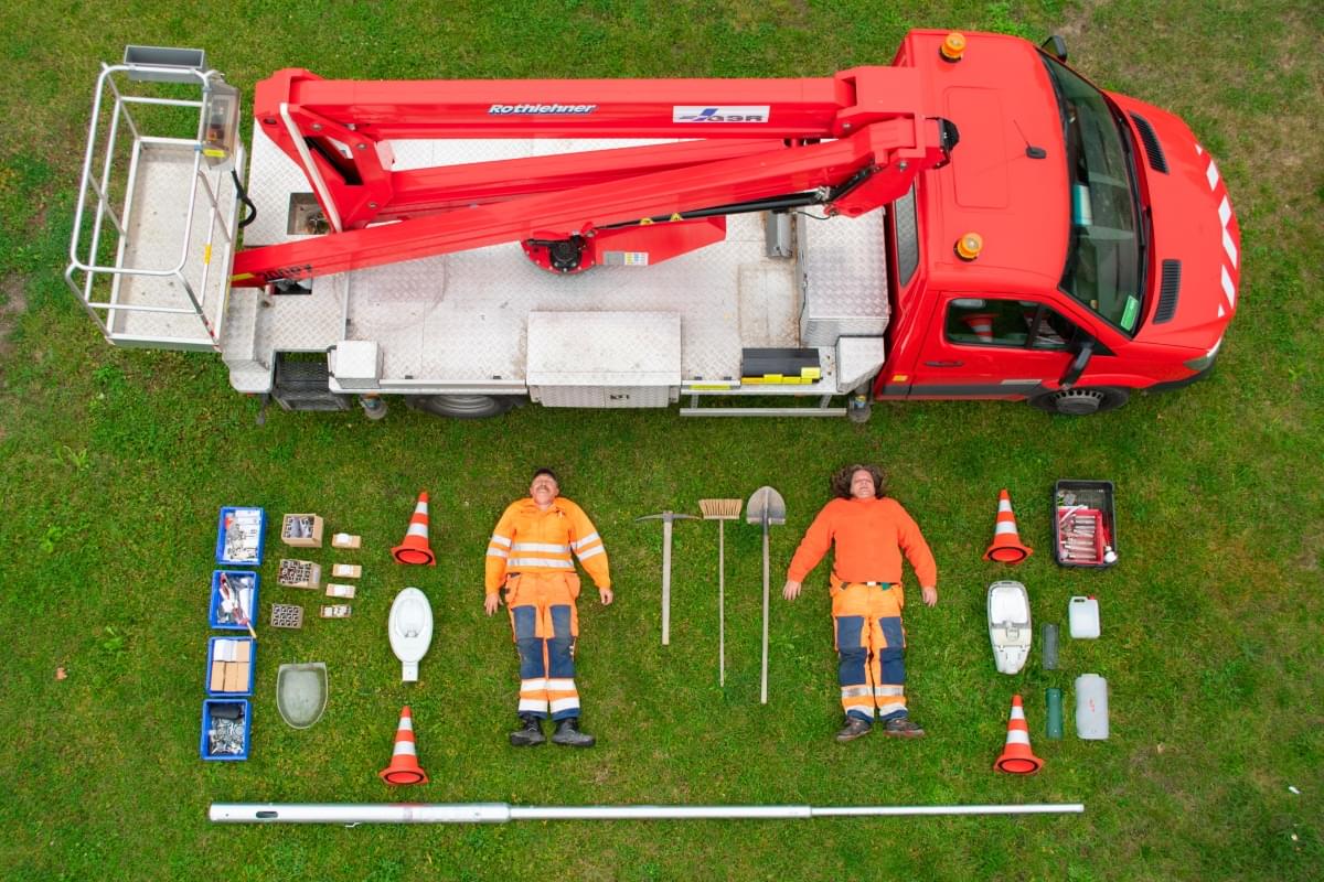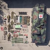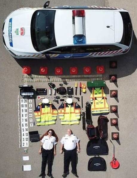 Jedná se o snímek z výšky, často z dronu, na kterém je vedle vozidla vyskládáno a srovnáno veškeré vybavení, mezi kterým leží i posádka.