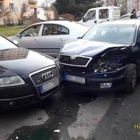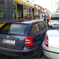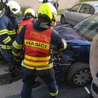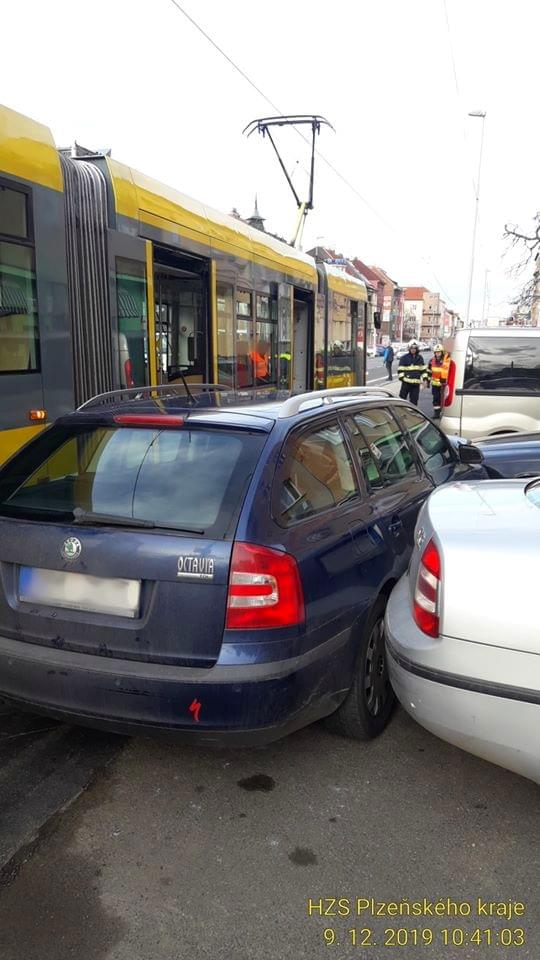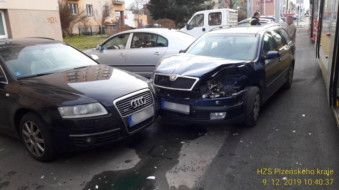 Tramvaj jedoucí ve směru do centra vůz zdeformovala a odhodila na zaparkované vozy.