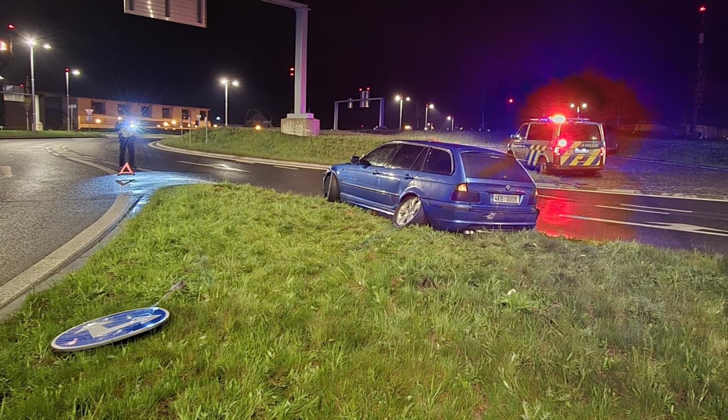 K první nehodě došlo došlo kolem jedenácté hodiny, když mladý ukrajinský řidič na kruhovém objezdu křižovatky západního obchvatu Plzně a Studentské ulice na mokré vozovce nezvládl řízení, dostal se do smyku, o vyvýšený ostrůvek vylomil zadní kolo svého vozu značky BMW a ještě srazil dopravní značku.