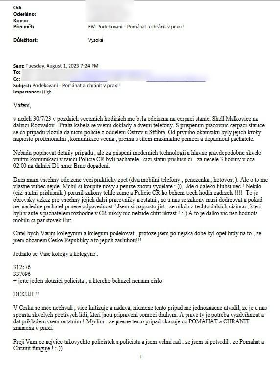 V neděli 30. července krátce po desáté hodině večer vyjížděli policisté z dálničního oddělení Ostrov u Stříbra k události, ke které došlo na čerpací stanici na dálnici D5 ve směru na Prahu. Nahlášeno bylo odcizení odložené tašky s osobními věcmi, peněženkou s finanční hotovostí 250 Euro, doklady, platební kartou a dvěma mobilními telefony.