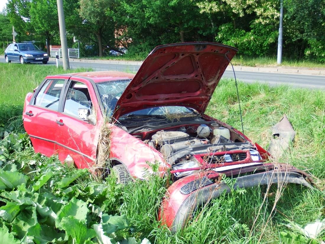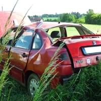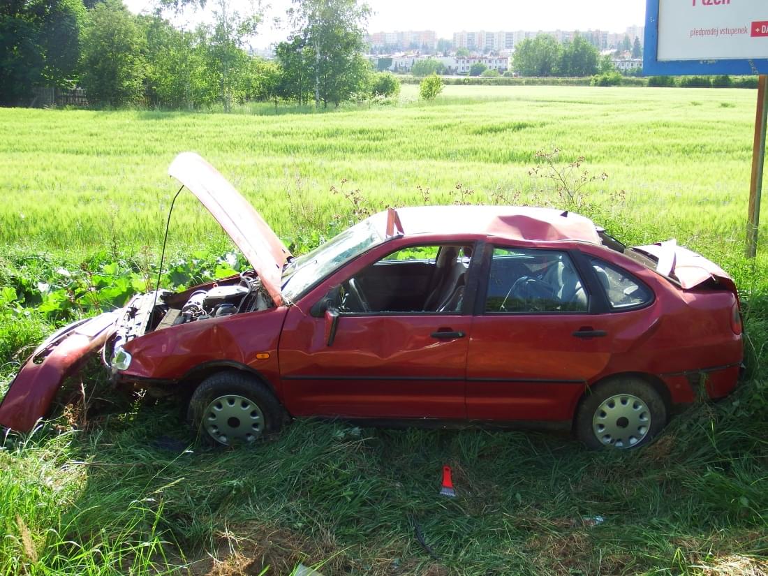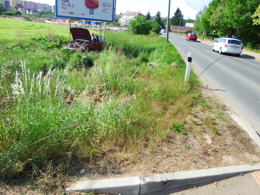 Řidič jedoucí ve směru na Lochotín přejel do protisměru, kde vjel do příkopu a narazil do mostku, který auto vymrštil a to přeletělo cestu a dopadlo do pole, kde se převrátilo přes střechu. Starší pár cestující ve voze měl obrovské štěstí a neutrpěl vážnější zranění. Samozřejmě ale oba cestující museli být transportováni do nemocnice.