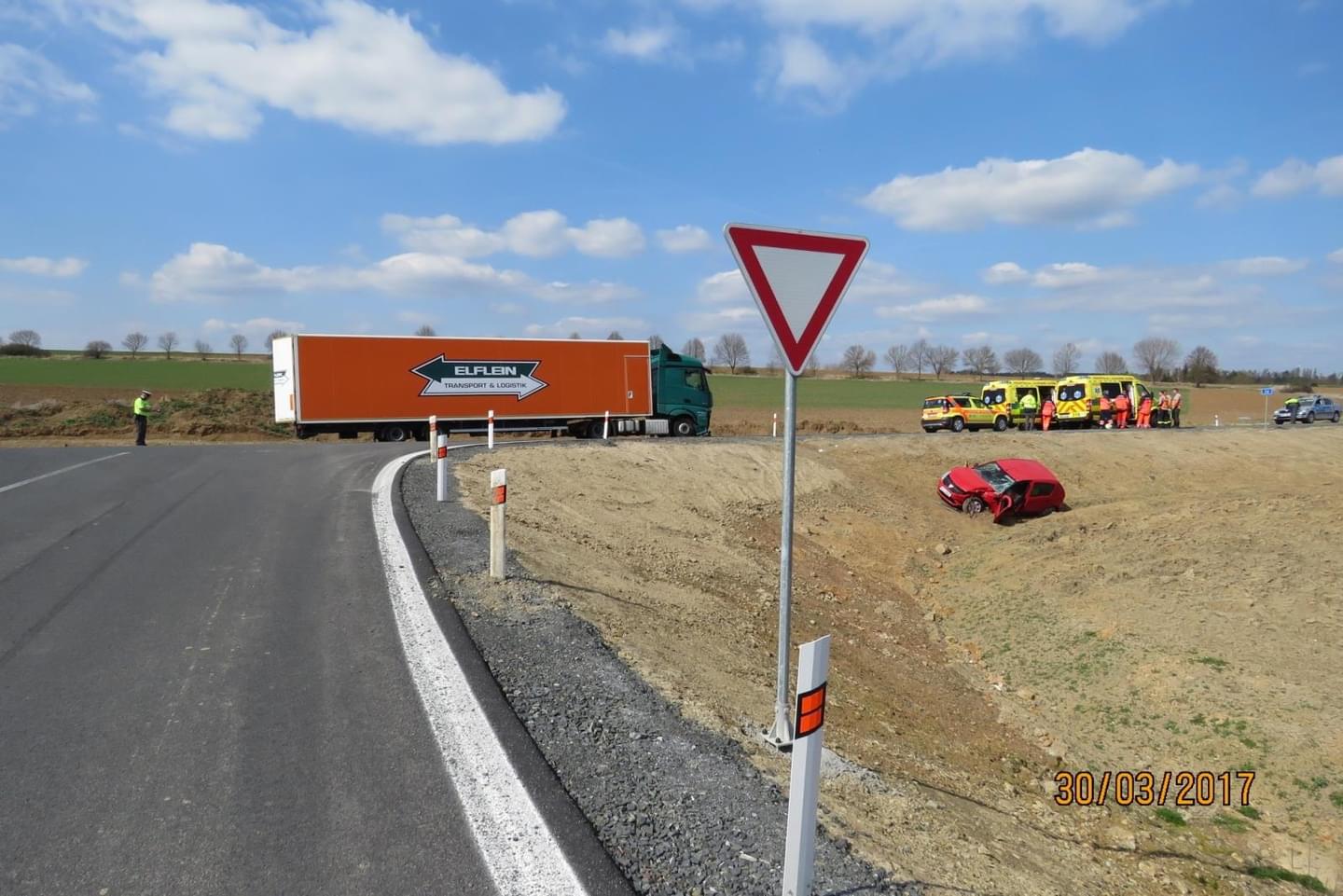 Dnes v půl druhé odpoledne došlo na obchvatu kolem Staňkova, zřejmě po nedání přednosti, ke střetu kamionu a osobního vozu. Podle prvotních informací je nehoda velmi vážná a vyžádala si jednoho velmi vážně a jednoho středně těžce zraněného.