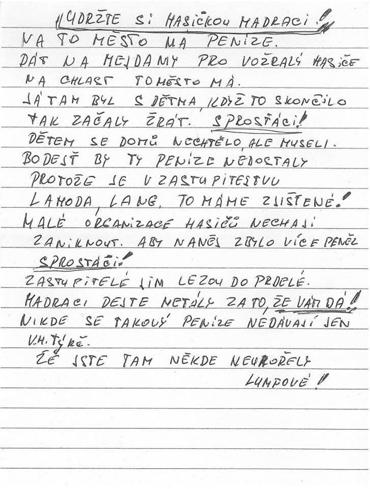 Dopis pak končil slovy: „Že jste tam někde neuhořely lumpové!“ (citujeme včetně pravopisné chyby).