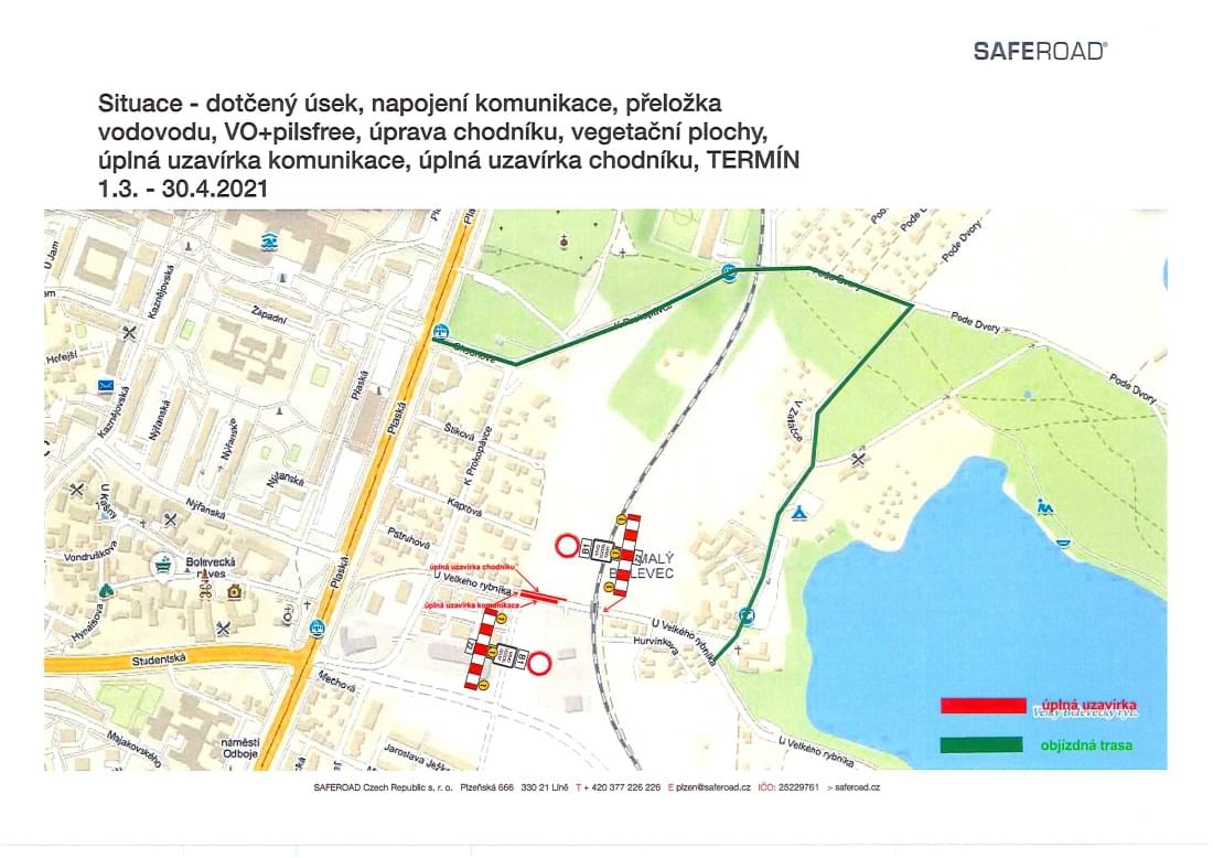 Od dnešního dne až do 30. dubna byl uzavřen úsek frekventované ulice U Velkého rybníka. Neprůjezdná je část od domu U Velkého rybníka 1010/26 až k železničnímu viaduktu a motoristé budou muset v obou směrech využít objížďku, která vede stejně jako trasa autobusu číslo 30, tedy ulicemi Plaská, Okounová, K Prokopávce a Malý Bolevec.