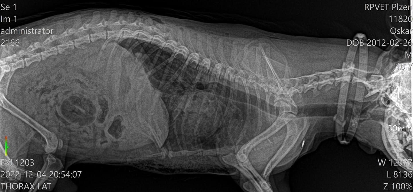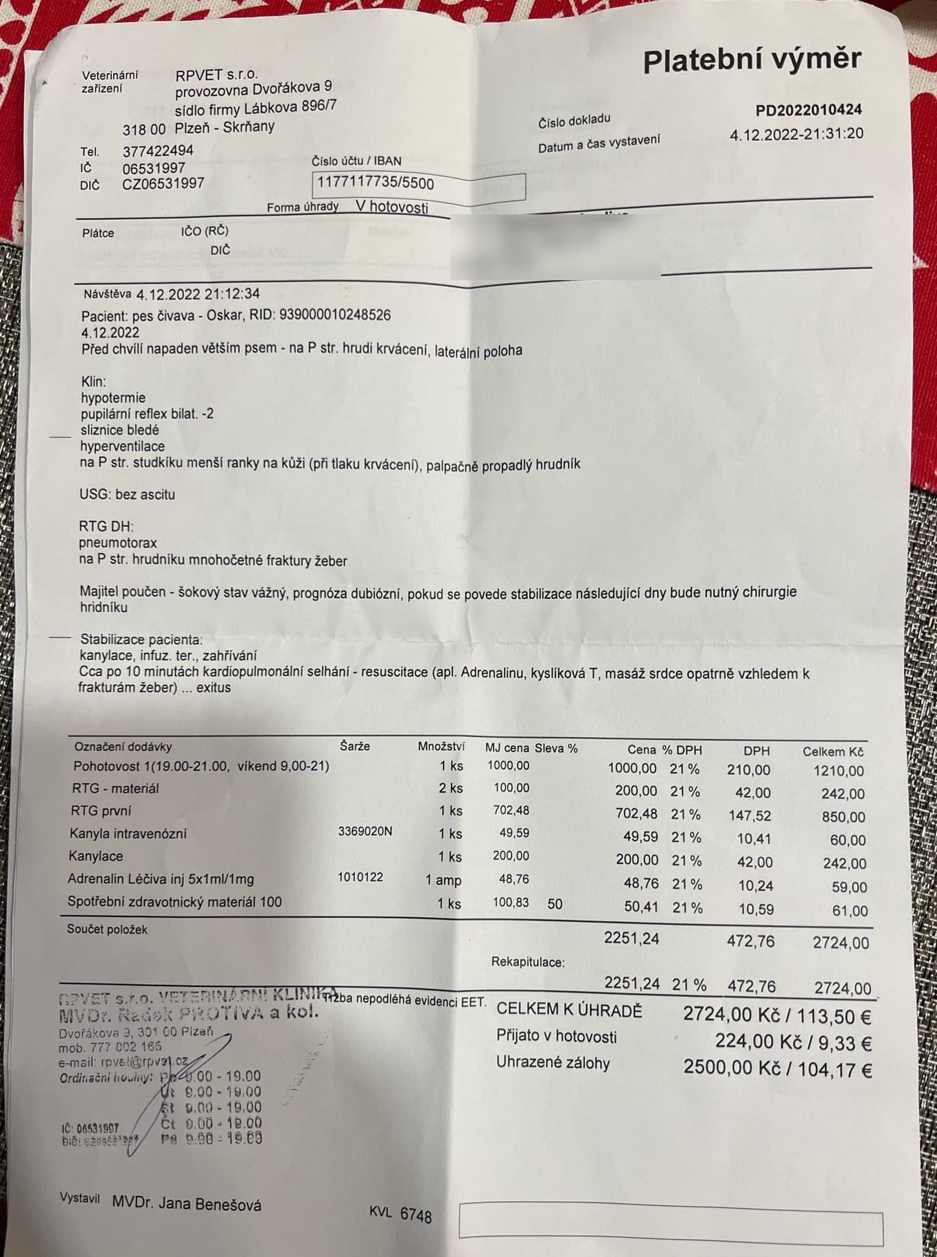 "Oskar ležel na zemi v krvi, takže jsme ho sebrali a hned jeli na veterinární pohotovost. Tam mu udělali RTG a jiná vyšetření, načež nám řekli, že má polámaná žebra a pneumothorax. Bylo nám oznámeno, že pokud přežije noc, udělá se chirurgický zákrok, ale po deseti minutách zemřel na kardiopulmonární selhání."