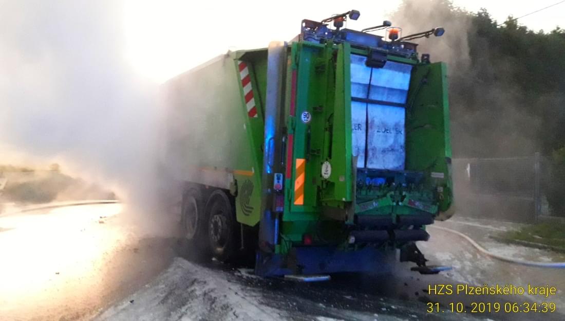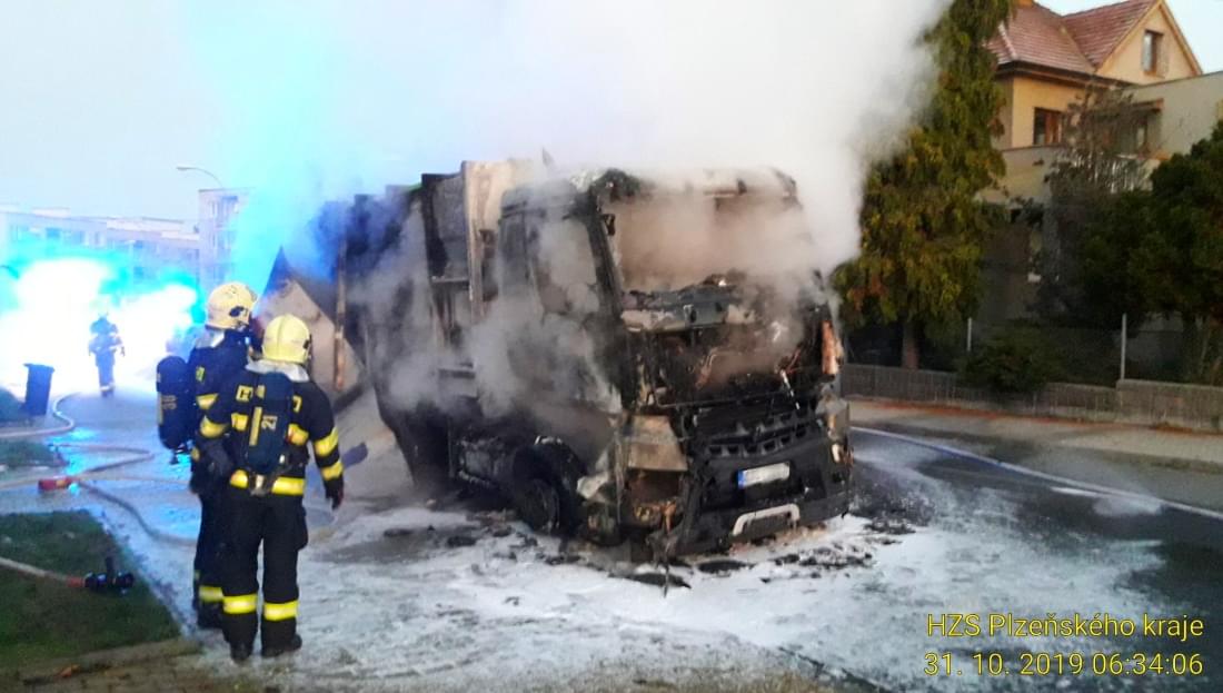 K požáru popelářského vozu vyjížděli hasiči dnes po šesté hodině ráno na křižovatku Školní a Hřbitovní ulice v Plzni Doubravce.