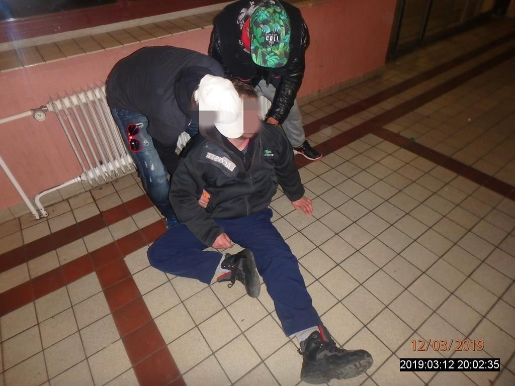 Tento muž byl v takovém stádiu opilosti, že zvednout se na nohy mu museli pomáhat strážníci i kamarádi.