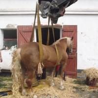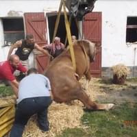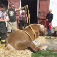 Hasiči ho ze stáje vytáhli pomocí plachty a následně za využití popruhů a místního bagru postavili na nohy.Veterináře si zajistil majitel sám.