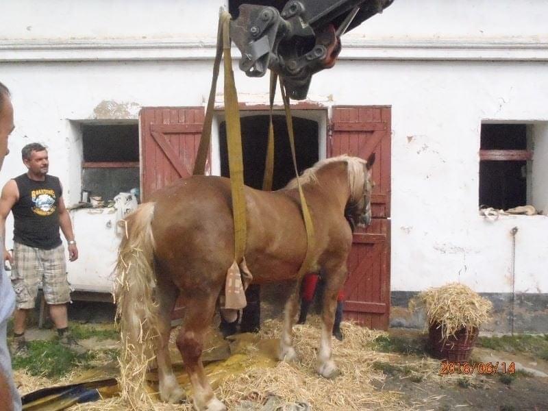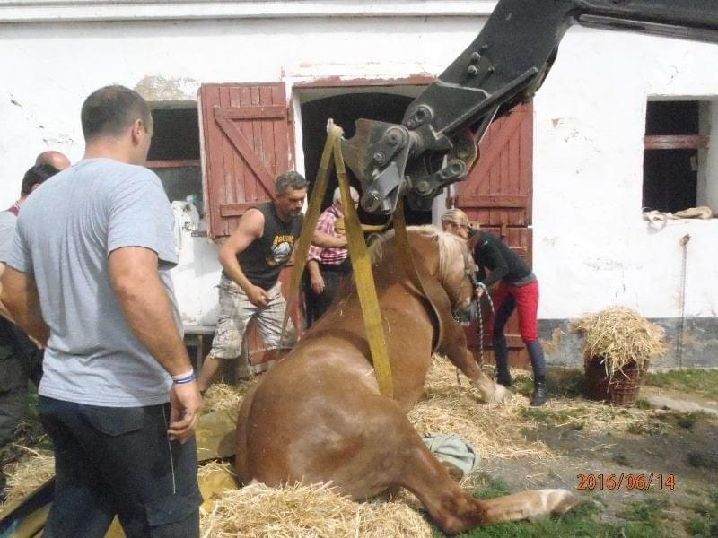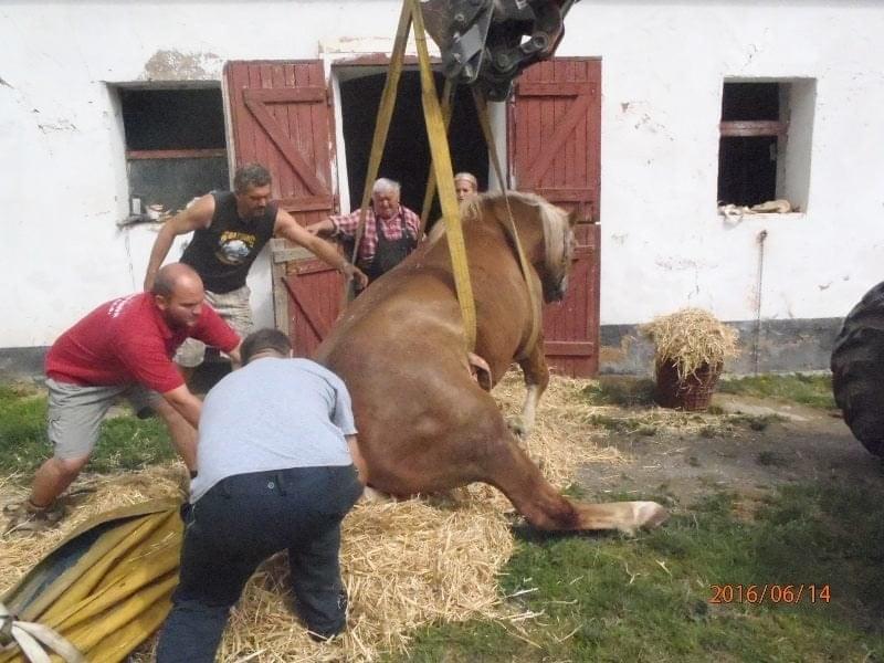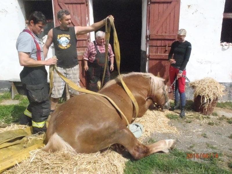 Hasiči ho ze stáje vytáhli pomocí plachty a následně za využití popruhů a místního bagru postavili na nohy.Veterináře si zajistil majitel sám.