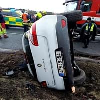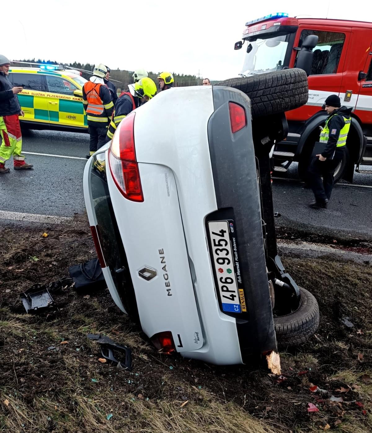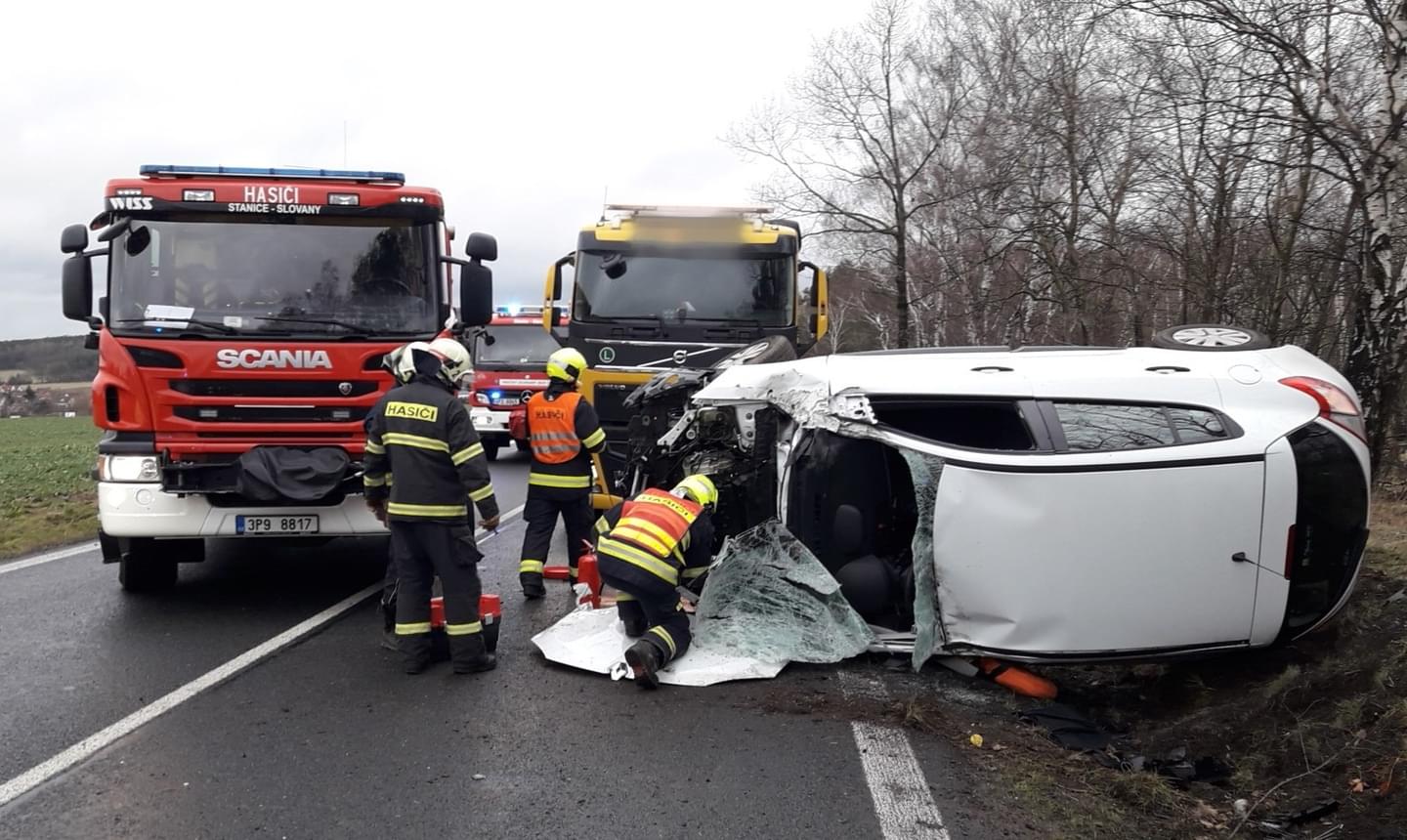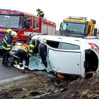 "Jedna osoba byla vyproštěna bez použití hydrauliky a předána záchranářům. Vozidlo je na boku částečně mimo komunikaci a došlo k úniku provozních kapalin," uvedl mluvčí hasičů.